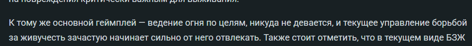 Сложность это одна из проблем т.к. идет рука об руку с глубиной механик - именно об этом ее виде я говорю, а не о том который подразумеваем “механику борьбы с управляемым юнитом”. Если от игрока почти ничего не требуется, если его контроль над статусом систем юнита минимальный и ему нужно только тыкать стрельбу не думая ни о чем, то на фоне всей остальной тундры это более чем проблема.