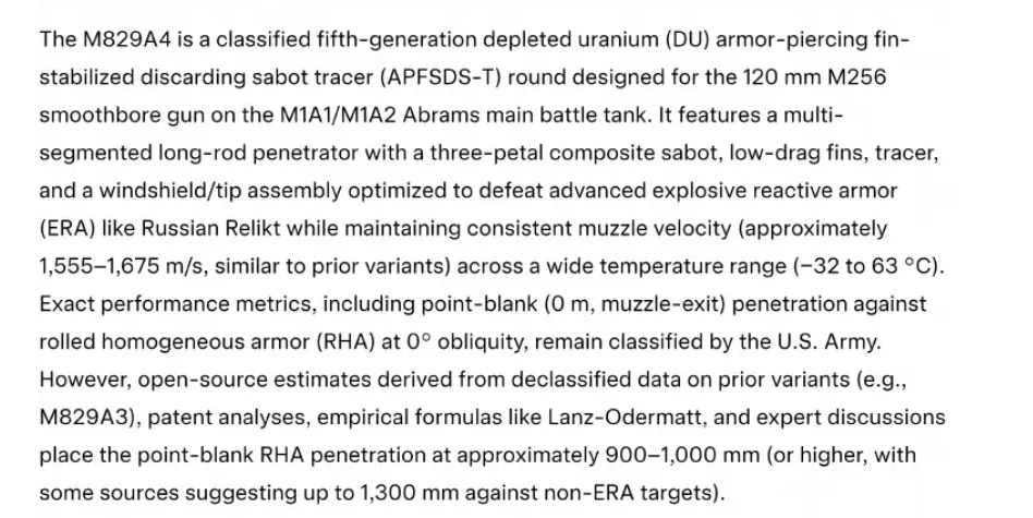 Однако оценки из открытых источников, основанные на рассекреченных данных предыдущих версий (например, M829A3), анализах патентов, эмпирических формулах вроде Lanz–Odermatt и обсуждениях экспертов, предполагают пробитие RHA на нулевой дистанции примерно 900–1 000 мм (или больше, некоторые источники указывают до 1 300 мм против целей без ERA).