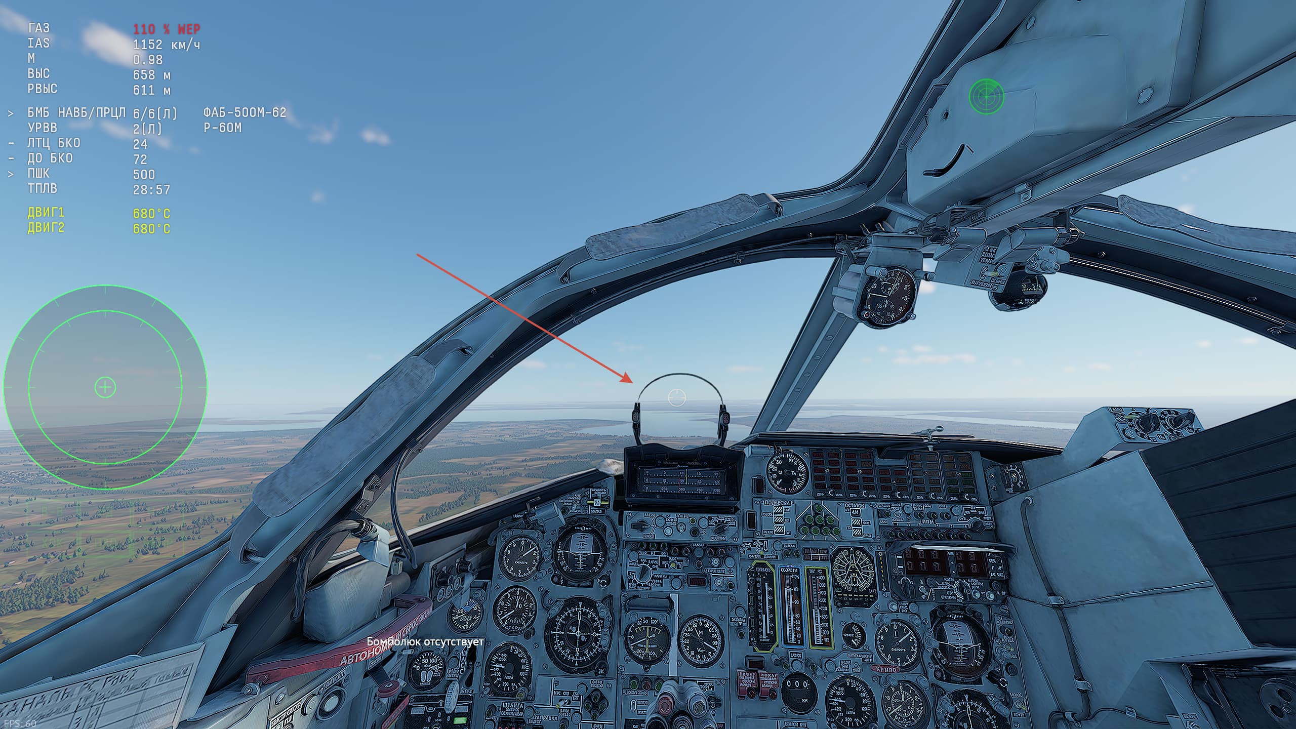 Индикация CCRP полностью отсутствует. В горизонтальном полёте нет ни линии курса, ни прицельного маркера, ни обратного отсчёта до точки сброса. Пилот не может понять, по какому курсу вести самолёт и когда именно нужно сбрасывать боеприпасы для попадания в цель.