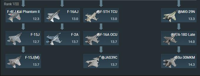 Так что у советов вполне себе нормальный сетап 13.3, так как есть большое количество Р-27ЕР или вовсе МиГ-29СМТ с хорошим радаром и Р-77.