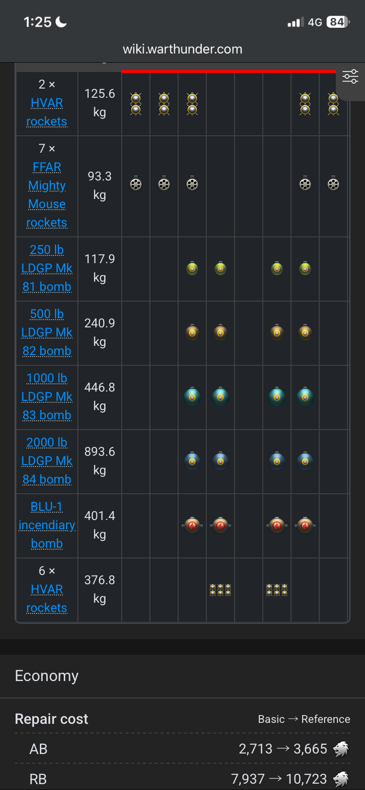 У F-84F (во всех ветках) показывается что он может нести 4 2000фн бомбы, хотя в игре только 2 (такая ошибка и на ру, и на англ вики)