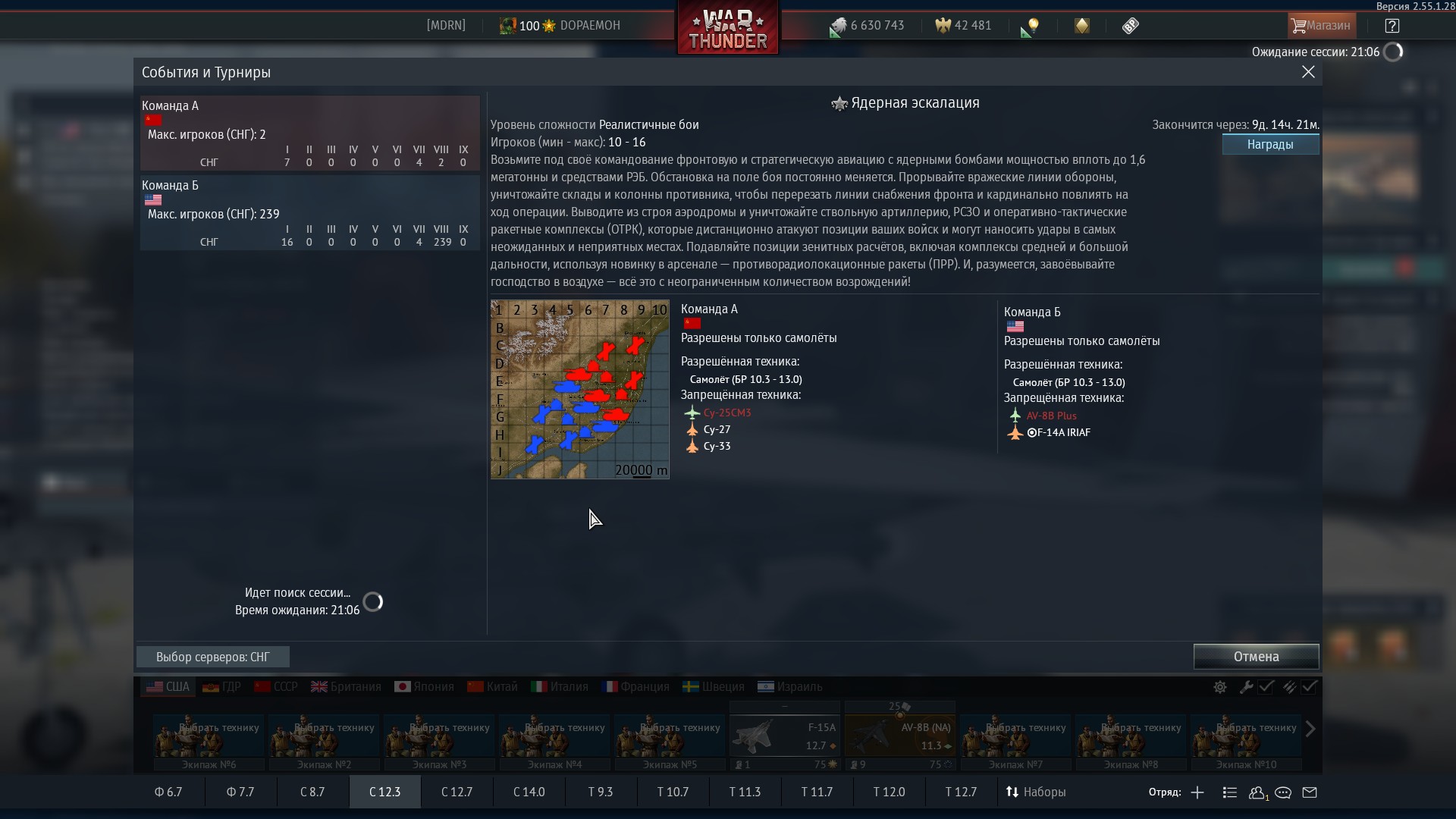 А именно: из-за разделения боёв на “нижний” и “верхние” сетапы, игроки желающие играть за “синих” на “верхнем” сетапе, не могут в бои зайти, т.к. у “красных” нет в большом количестве авиации 12.7, а авиация “красных” с 13.0 по понятным причинам в ивенте не участвует.