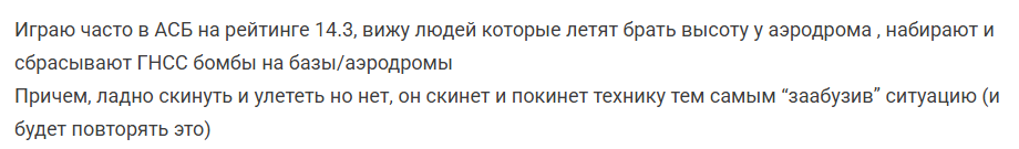 Играю часто в АСБ на рейтинге 14.3, вижу людей которые летят брать высоту у аэродрома , набирают и сбрасывают ГНСС бомбы на базы/аэродромы