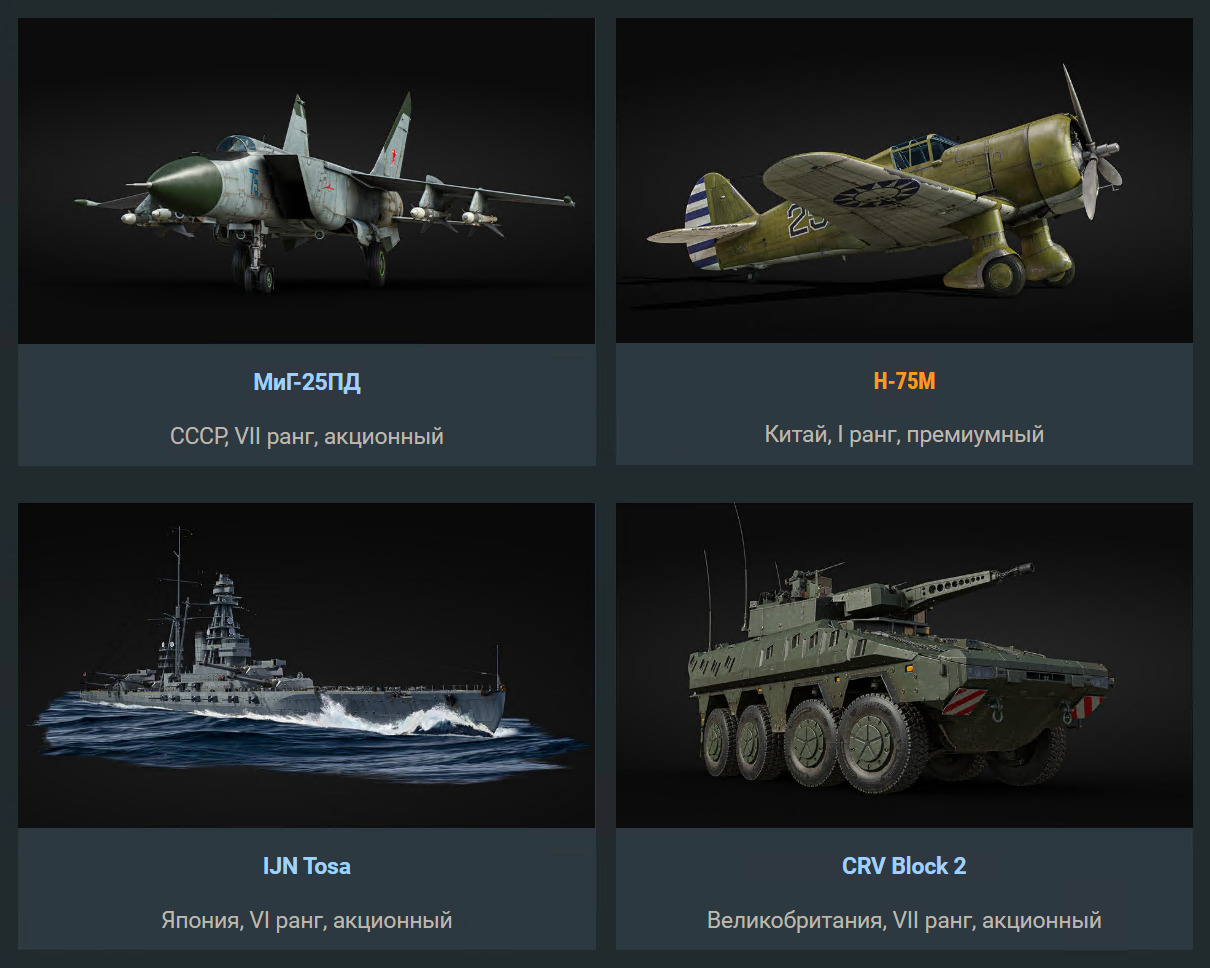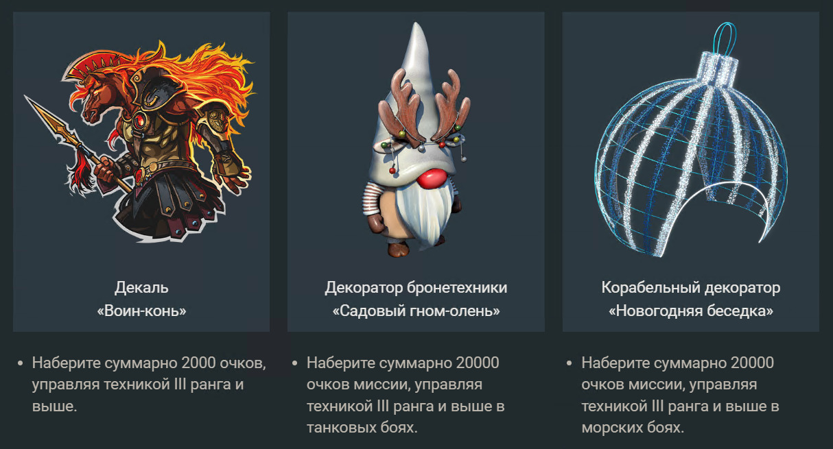 Вы можете получить акционную высокоранговую технику всех видов войск, трофеи с наградами, камуфляжи для техники события, иконку игрока, декораторы и коллекцию тематических декалей.