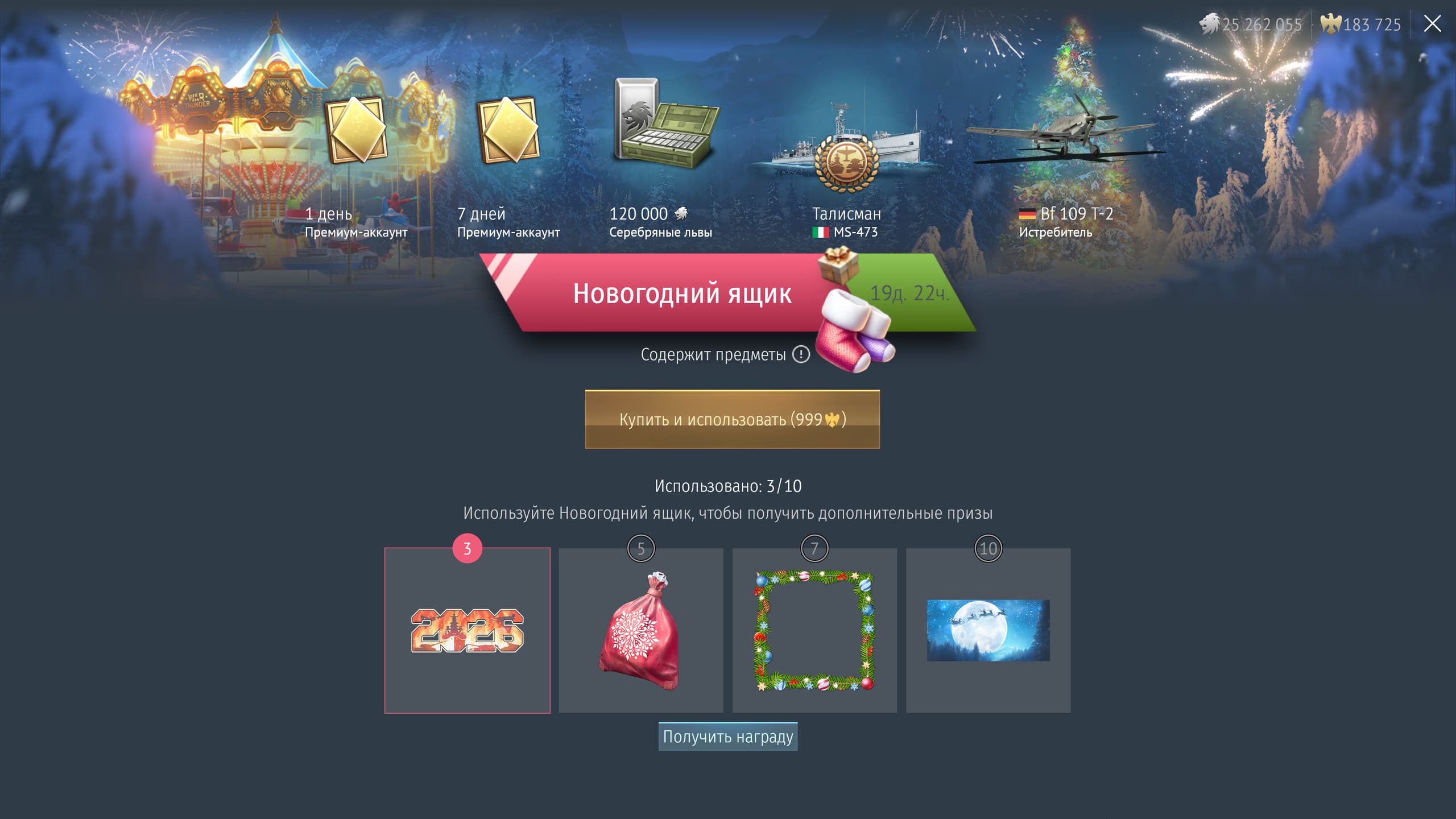 Покупка новогоднего ящика — дело выгодное! При достаточном количестве открытий ящика вы гарантированно получаете талисманы и премиумную технику. А средняя стоимость содержимого ящика почти в полтора раза выше его цены!