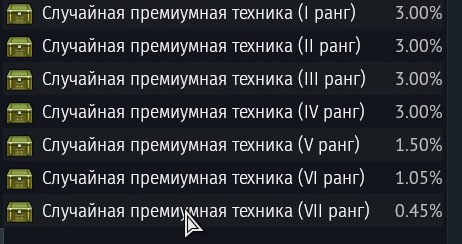 Причём внутри ящика там еще шанс 100% делится между техниками этого ранга, уже купленная вычитается