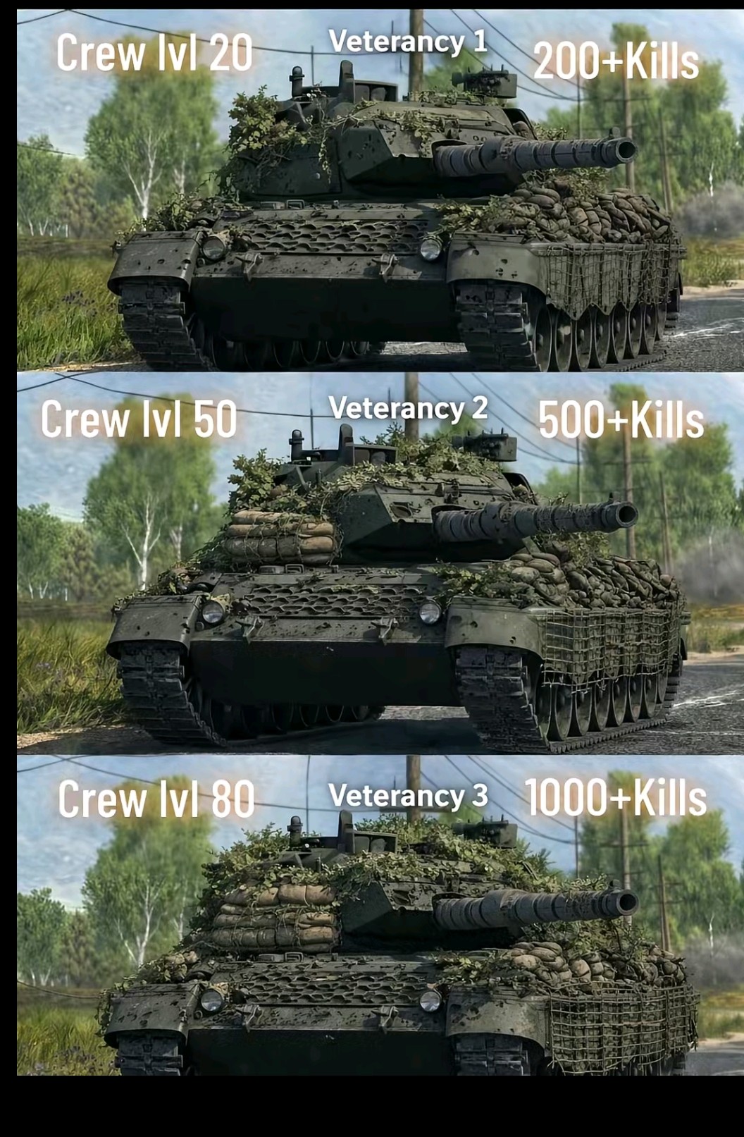 Что-то подобное в игре уже присутствует, такое доступно каждой машине после попадания в неё крупнокалиберного фугасного снаряда, или взорвавшейся бомбы, но я предлагаю дать игрокам возможность получить имитацию таких попаданий (опять же, отремонтированную в кустарных условиях) для создания атмосферы техники закаленной в боях и той, что только что прибыла на вооружение.
