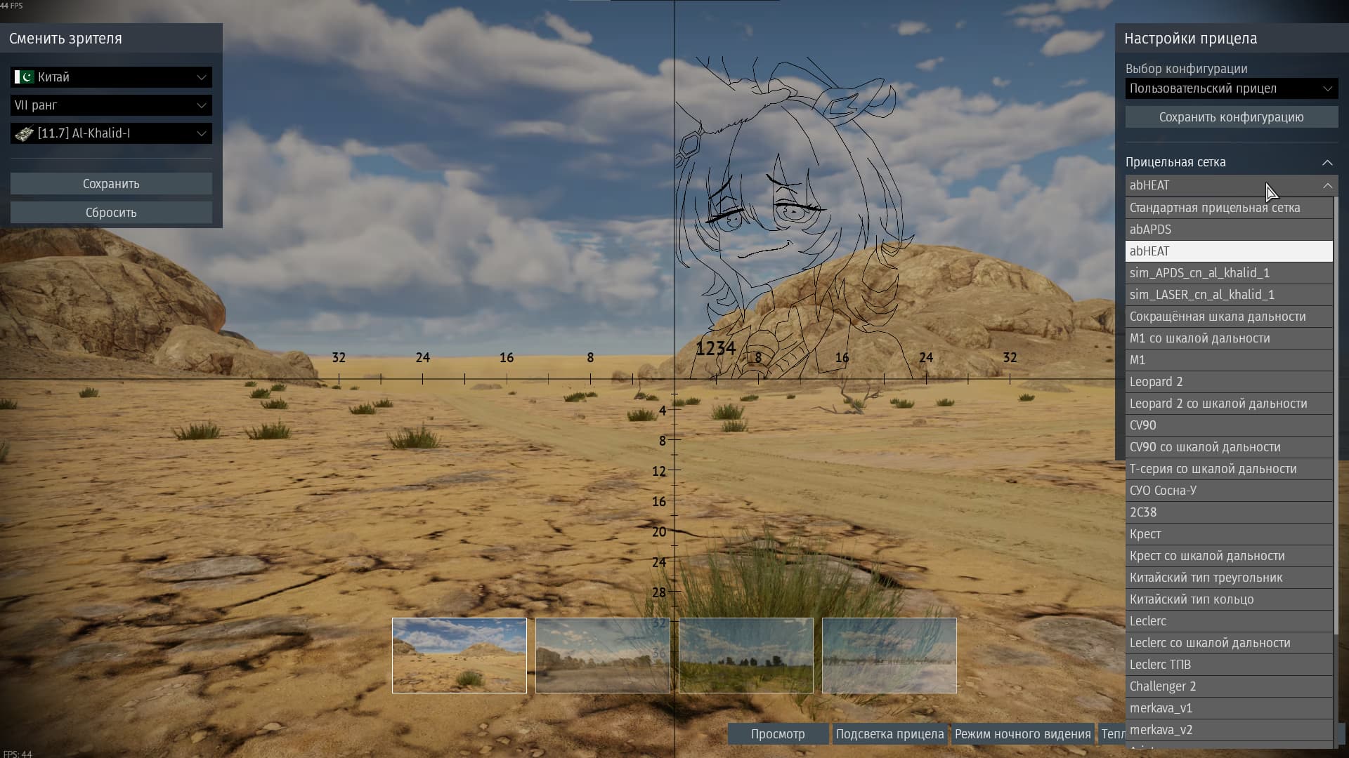 Выберите прицельную сетку в меню «Прицельная сетка»;