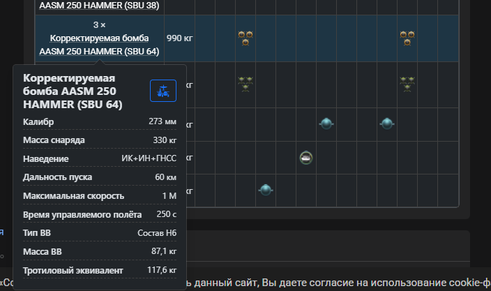 - Изменены правила расчёта Очков возрождения для подвесного вооружения самолётов, в составе которого имеются корректируемые бомбы. Теперь стоимость такого вооружения зависит не только от массы бомб, но и от типа их наведения. КАБ с комбинированным наведением, сочетающим ГНСС и ЛГСН, также как и КАБ с ГСН, работающей в видимом диапазоне (ТВ), получают дополнительный множитель, равный 1.1. КАБ с ГСН, работающей в ИК диапазоне, получают дополнительный множитель, равный 1.3. Например, МиГ-27К при базовой стоимости самолёта 540 ОВ с четырьмя КАБ-500Кр суммарной массой 2080 кг теперь будет требовать для возрождения 540 * 1.4 (множитель массы для 2000 кг и более КАБ) * 1.1 (ТВ ГСН) = 832 ОВ. Typhoon (AESA) при базовой стоимости самолёта 540 ОВ с восемью SPICE 250 суммарной массой 1040 кг теперь будет требовать для возрождения 540 * 1.272 (множитель массы для 1040 кг КАБ) * 1.3 (ИК ГСН) = 893 ОВ. Если на самолёт установлены КАБ с разным типом наведения, то для всей массы КАБ будет взят максимальный множитель типа наведения. Для корректного отображения Очков возрождения самолётов с корректируемыми бомбами может быть необходимо перезапустить клиент игры.