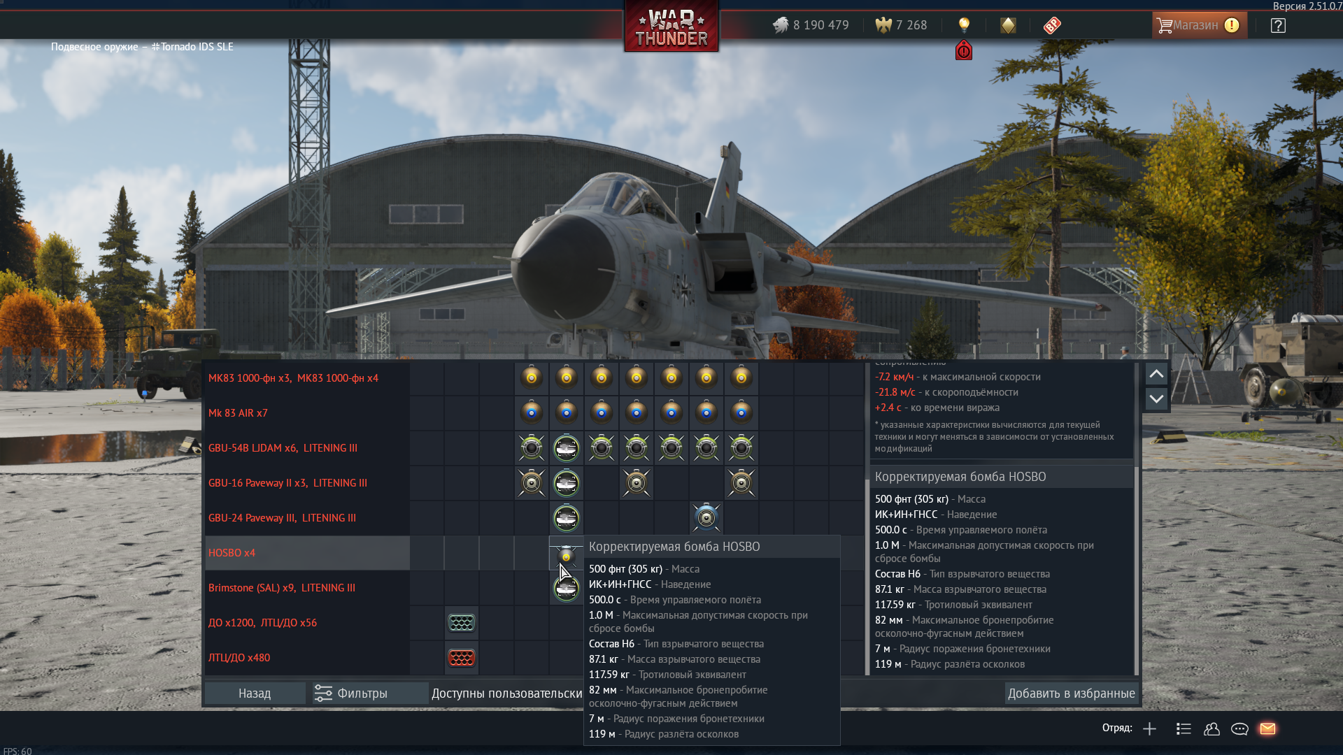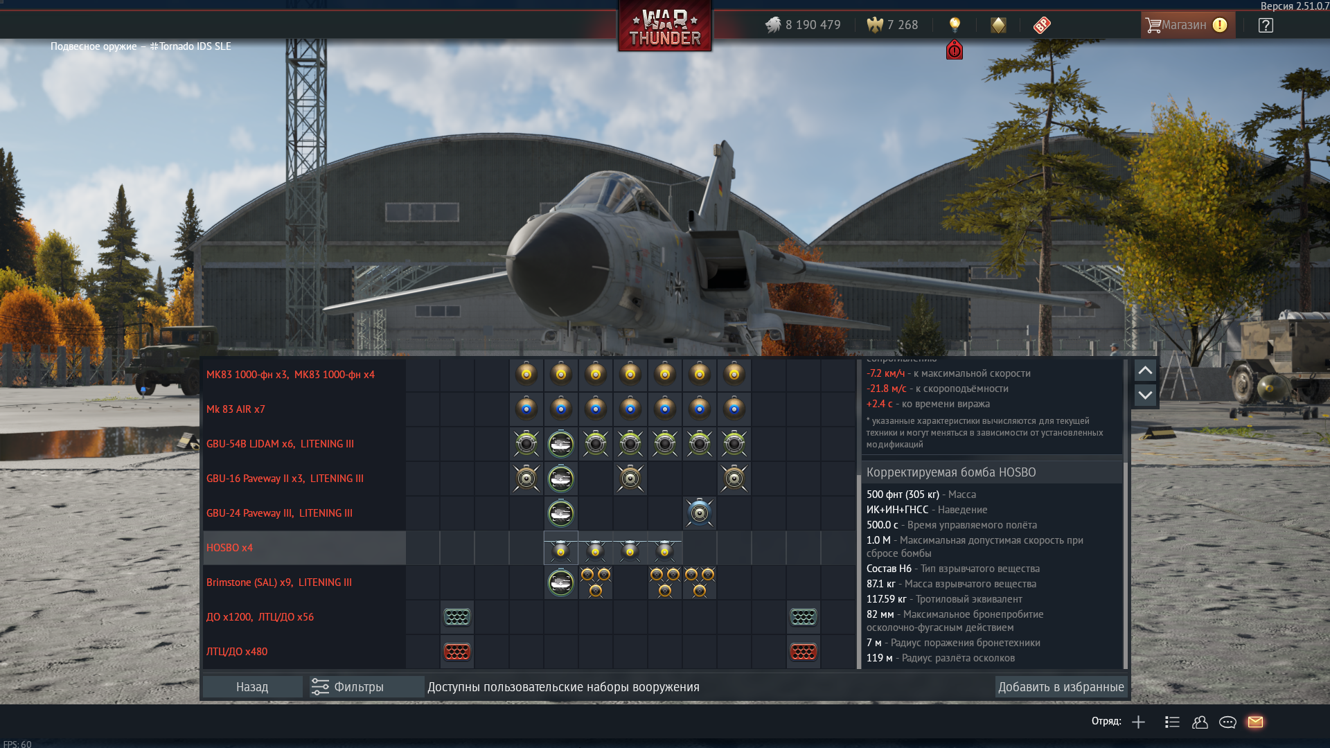 - slot 8 changed: option changed: 1x HOSBO: it can now be equipped together with: 3x Brimstone on slot 7, 1x 1000 lb GP Mk. 83 (stock) on slot 7, 2x 1000 lb GP Mk. 83 on slot 7, 1x 1000 lb GP Mk. 83 Mod. 1 (BSU-85) on slot 7, 2x 1000 lb GP Mk. 83 Mod. 1 (BSU-85) on slot 7, 1x 500 lb GBU-54(V)1/B on slot 7