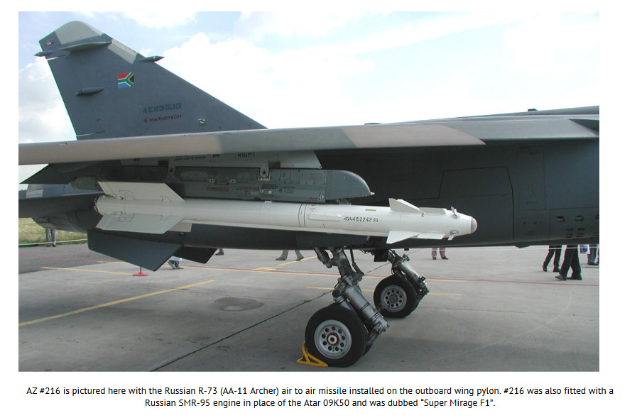 у ЮАР даже базовая версия с приколами – там нашлемка появилась серийно до того, как советы её сделали мейнстримом. я слышал версию, что именно после столкновения советских самолётов с африканскими миражами наше руководство добавило к ТЗ по новым истребителям требование нашлемки.