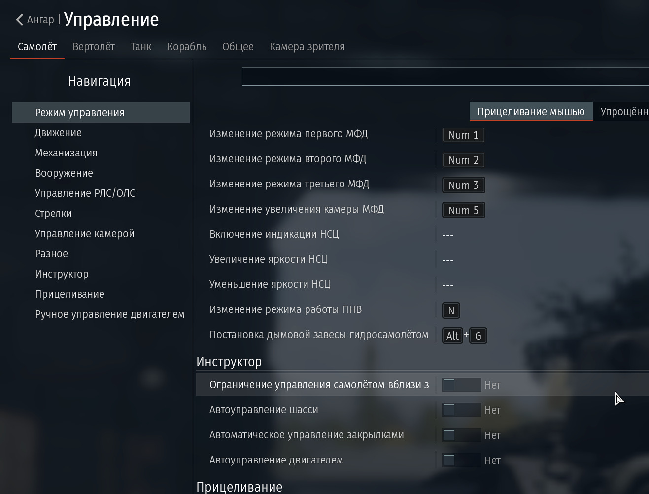 Управление мышью исключает свободное управление самолётом в режиме прицельного контейнера, тут только на полное управление переходить