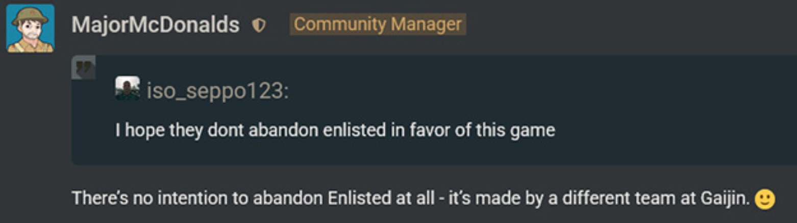 Хочешь прикол?) Сначала КМ написал: “different team at Darkflow”. Через неделю я зашёл его коммент заскринить и там уже красовалось: “different team at Gaijin”. И значок редактирования.