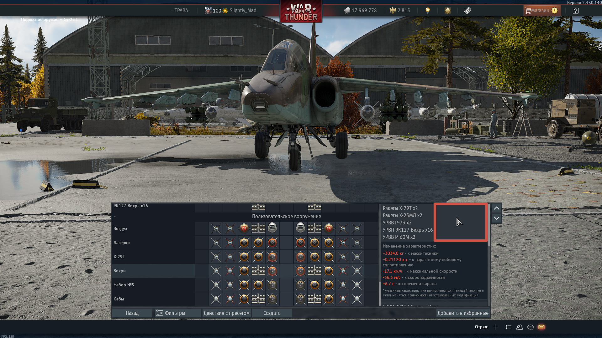 На борту есть 16 Вихрей, 2 Х25МЛ, 2 Х29Т, 2 Р73, 2Р60. Итого, 3 УРВП и 2 УРВВ. Если селектор выключен, по умолчанию сначала пускаются МЛки, потом 2 вихря, потом 2 Х29Т, потом оставшиеся вихри. По умолчанию сначала кидаются две Р60, потом Р73. У меня стоит циклический селектор вперед на клавишу “1”, выход из меню выбора оружия на “Alt+R”, сброс корректируемых бомб “3”, пуск НУРСов “R”, УРВП “V”, УРВВ “5КМ”, обычный бомбы “ПРОБЕЛ”. Раньше, когда не было подвидов среди одной группы, еще можно было как-то обходится этим набором. Ну или брать подвесы 1 кнопка - 1 вид, тогда селектор в положении ВЫКЛ. Если внутри одной группы вооружений есть 2 и более вида, то селектором назначаю тот, что идет не по умолчанию: нажимаю “1” - включается селектор, перебираю до нужного, выключаю. Селектор запоминает выбранное вооружение и при повторном включении сразу выбирает его. На Су-25Т после отстрела Х29Т ставлю вихри или Р73, чтобы иметь возможность быстро на них переключиться. Аналогично делаю на самолетах в АРБ, на селектор ставлю не то, что по умолчанию и получаю быстрое переключение между ИК и ПАРЛ ракетами, например.