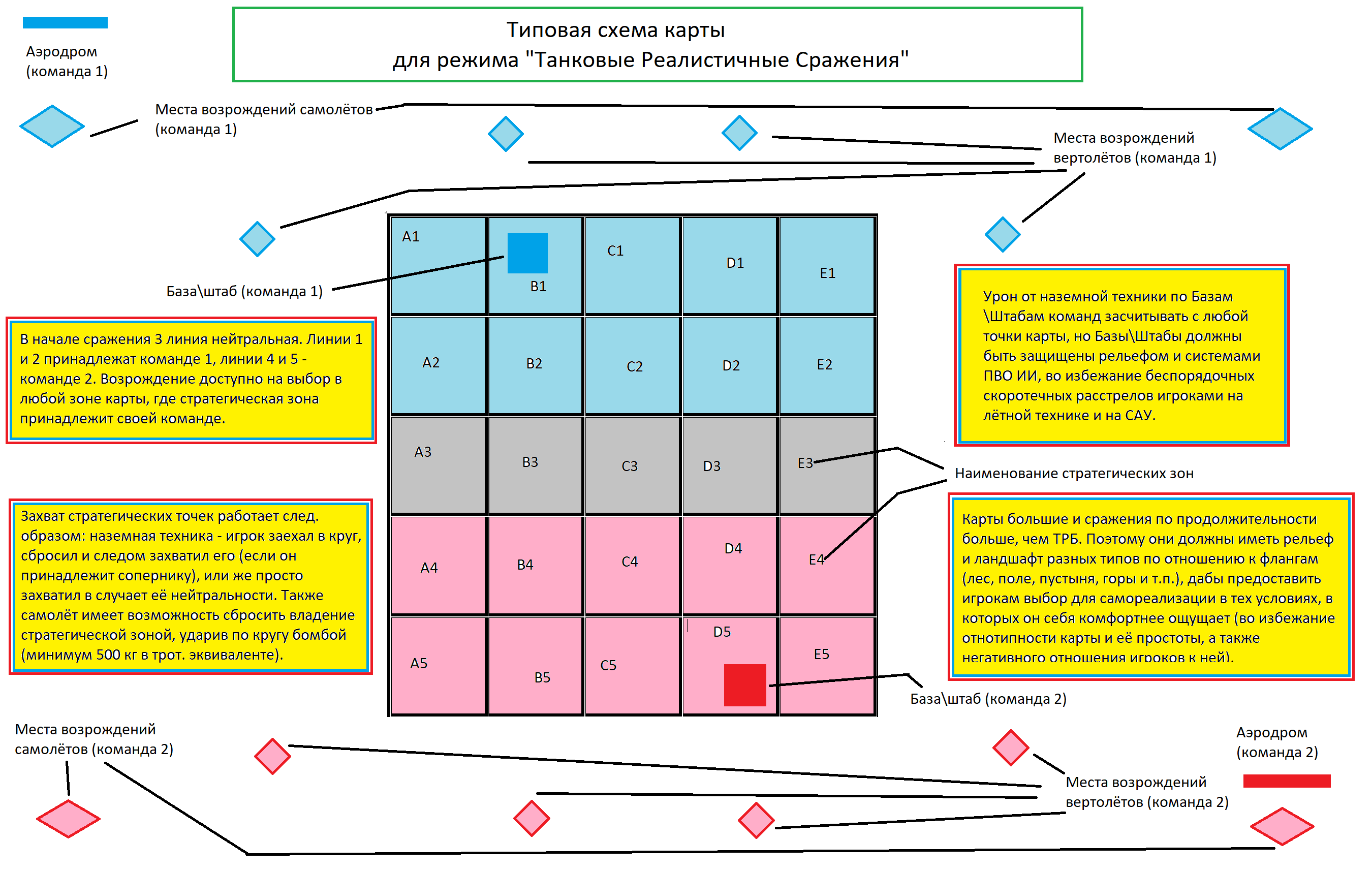 ПРИ ПОДГОТОВКЕ КАРТЫ ВАЖНО учитывать, что необходимо создавать выбор мест возрождения: для игроков на танках – это фланги и линии ведения боевых действий, для игроков на самолётах и вертолётах – это направления, с которых можно осуществить авиаудар. Таковых мест возрождений должно быть по несколько штук, с разных направлений и на той линии, на которой идёт боевое соприкосновение относительно направления (ОБЯЗАТЕЛЬНО для наземной техники во избежание долгого перемещения от места возрождения до места боевого соприкосновения команд, а также жёсткого контроля вертолётных и самолётных мест возрождения соперниками). В ДАННОМ СЛУЧАЕ будет достигнуто РЕШЕНИЕ 3-его ФАКТОРА проблемы.