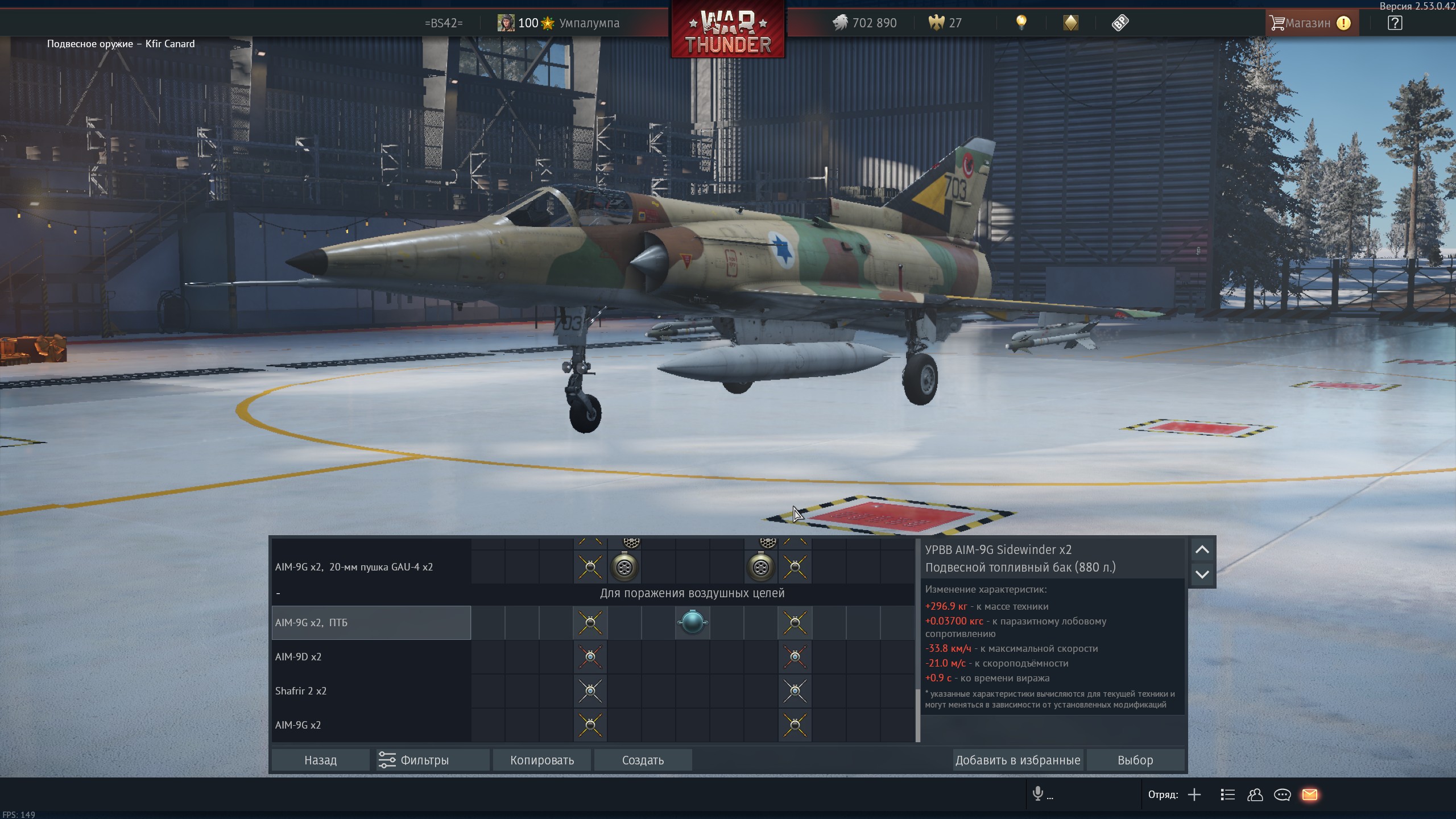 Подвесные баки на кральях, на которые вешаются бомбы не заполняются топливом, когда простой бак по центру не имеет такой проблемы, для Kfir Canard данная проблема актуальна, так как если летать на форсаже то 30 минутного бака хватит минут на 10-15. Надеюсь на это обратят внимание. Во всех ниже приведенных скринах доп бак 8:39 три их или он один.