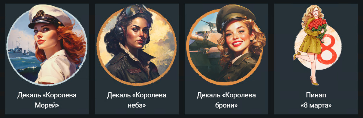 С 6 марта (11:00 МСК) до 9 марта (11:00 МСК) заработайте 3000 очков миссии в боях, где вы использовали технику любой страны (от III ранга), и получите трофей «Международный женский день». В нём вы найдёте одну из 4 декалей, которые в прошлые годы можно было получить на этот праздник:
