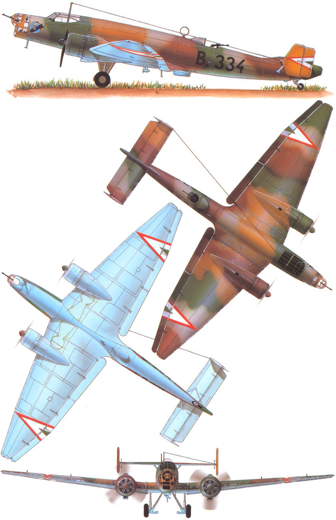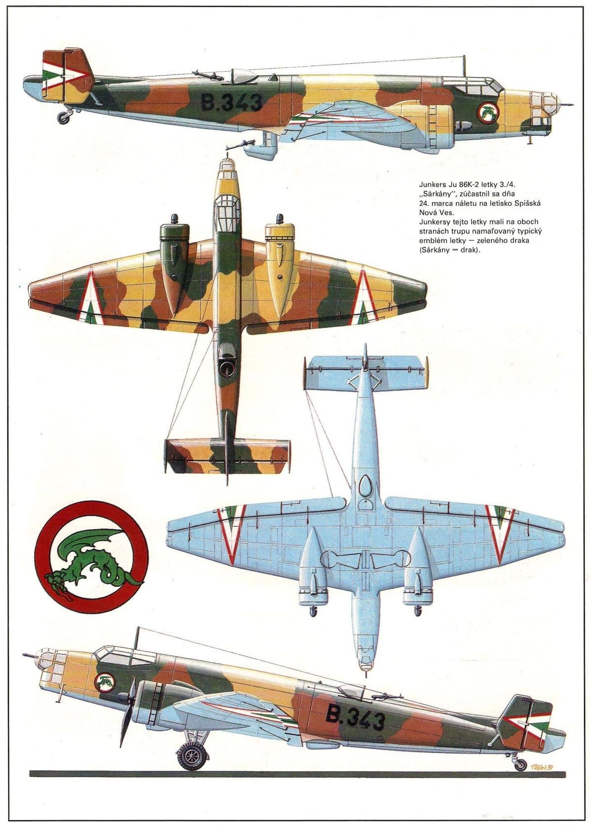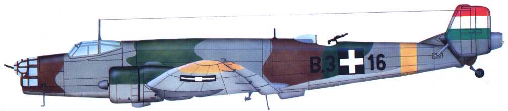 Самый крупный заказ на Ju.86 поступил от Венгрии. После рассмотрения вопроса о возможности производства Не.111 с лицензионными двигателями Гном-Рон-14К “Мистраль-Мажор” венгры остановились на закупке бомбардировщиков Юнкерса с теми же двигателями. Ими планировалось оснастить две бомбардировочные части своих “секретных” ВВС. В 1936 г был выдан первый заказ на 24 Ju.86K-2, а всего было закуплено 66 бомбардировщиков. Поставки Ju.86K-2 в венгерские ВВС шли с перебоями из-за неспособности Манфред Вейсс выдержать график производства Гном-Рон-14К. Первый бомбардировщик был поставлен в Венгрию только в начале 1938 г. На Ju.86K-2 перевооружили 3-й бомбардировочный полк. 1-я группа полка (3./I) в Таполка имела три эскадрильи (3/1, 3/2 и 3/3) по девять машин в каждой, а 3./II в Папе – две эскадрильи (3/4 и 3/5). Кроме того Ju.86K-2 получила одна эскадрилья второго бомбардировочного полка (2/3), и по одному звену было в двух других эскадрильях (2/4 и 2/5) на аэродроме в Шомбатхели. В марте 1939 г, вскоре после оккупации немцами Чехии и образования независимой Словакии, венгры заняли район Карпато-Русения. Во время этого скоротечного конфликта использовались 18 Ju.86K-2 из эскадрилий 3/3, 3/4 и 3/5, совершавших налеты на аэродром Игла и оборонительные позиции словаков у Перецcенской долины. Следующим летом эскадрилья 2/4 была переформирована в 1-ю учебно-боевую эскадрилью со смешанным составом из Ju.86K-2 и Fw.58. Осенью 2-й бомбардировочный полк был расформирован. Одновременно был создан 4-й полк на базе Ju.86K из эскадрильи 3/3 и бывшего 2-го полка. Его эскадрильи – 4/3 и 4/4 базировались в Весцпреме. 1-я группа получила оставшиеся эскадрильи (3/1 и 3/2) 1-й группы 3-го полка, они стали соответственно 4/1 и 4/2. Таким образом венгерские ВВС имели после реорганизации три группы (3./II, 4./I и 4./II двухэскадрильного состава с Ju.86K-2.