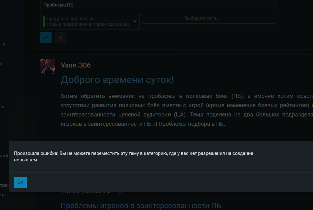 Хотим обратить внимание на проблемы в полковых боях (ПБ), а именно хотим осветить проблему отсутствии развития полковых боёв вместе с игрой (кроме изменения боевых рейтингов) и уменьшении заинтересованности целевой аудитории (ЦА). Тема поделена на два больших подраздела: I Проблемы игроков в заинтересованности ПБ; II Проблемы подбора в ПБ.