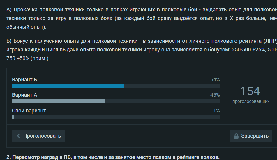 Есть дополнение к первому пункту: Добавлять в игру новый тип техники. Который может прокачиваться только при игре в ПБ. При этом его могут прокачать все даже самые слабые полки, но(!) если они будут набивать ЛПР. Количество ЛПР будет влиять на скорость прокачки этой “особой полковой техники”. Слабые будут качать медленней, сильные будут качать быстрее. Это повысит мотивацию игроков вообще играть в этот режим, а так же повышать в нём свою эффективность.