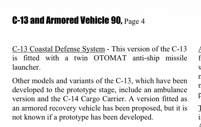 Блин, очень бы хотелось увидеть C-13 Coastal Defense System. Это C-13 (типа как C13/TUA) только ей на крышу бахнули пусковые установки для двух ПКР OTOMAT (без понятия это выглядит). Есть какой то документ (без понятия насколько он достоверный) и там об такой дичи пишут