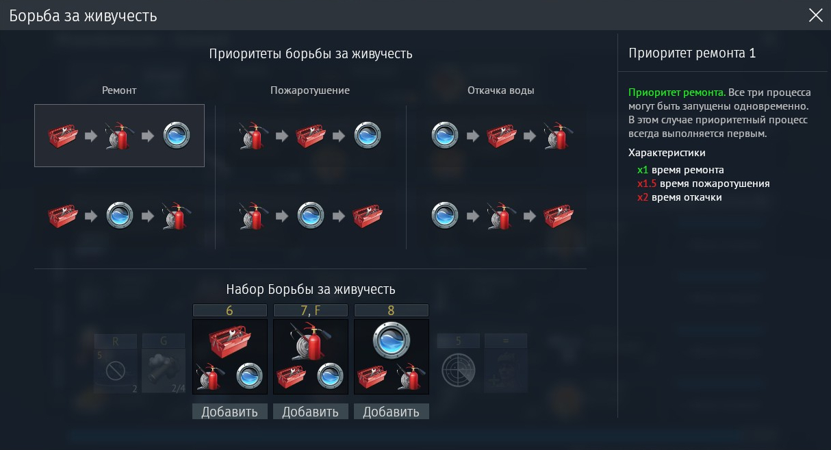 В этом окне вы сможете собрать набор борьбы за живучесть, выбрав 3 пресета из представленных и назначив их на 3 действия, которые сейчас отвечают за пожаротушение, ремонт и откачку воды.