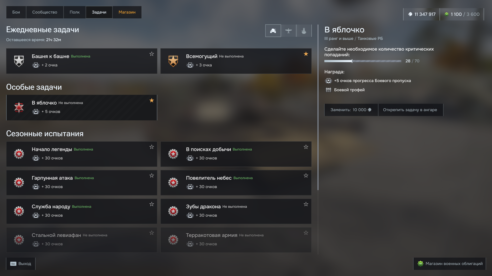 Боевые задачи, учитывая их важность для прохождения боевого пропуска, были перенесены в основное меню. Новый экран объединил в себе сразу задачи и испытания, так как они отвечают одной цели. Здесь игрок сможет закрепить необходимые для него задачи на главном экране.