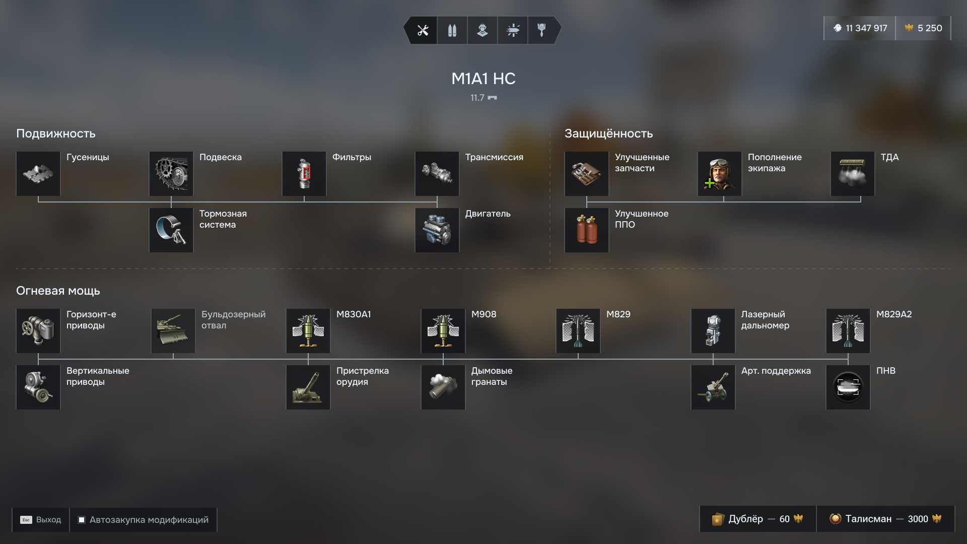 Здесь я изменил не только интерфейс, но и саму систему прокачки модулей. Категории модулей не имеют связи между собой через ступени. Каждую категорию можно прокачивать в свободном порядке, но последовательно внутри самой категории. Для подвижности 4 уровня, для защищённости – 3, и для огневой мощи целых 7. Если на одном уровне предусмотрено к прокачке сразу 2 модуля, то исследование одного из них всё равно будет открывать доступ к прокачке следующего уровня.