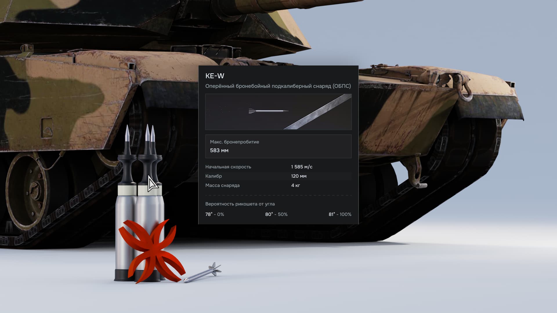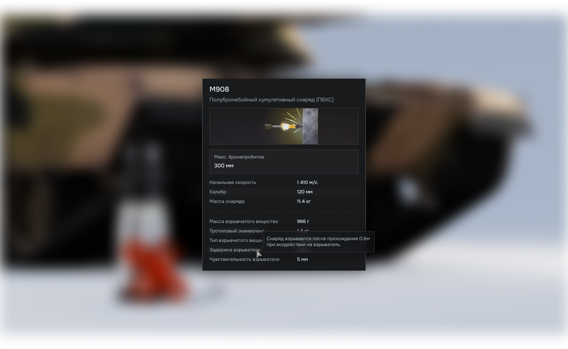 Сохранена анимация снаряда, так как это лучшая демонстрация его действия. Далее идёт блок данных, отвечающие за бронепробитие, и следом за урон. К каждому показателю приложены подсказки, карточка должна не просто давать сухие данные, но и объяснять механику.