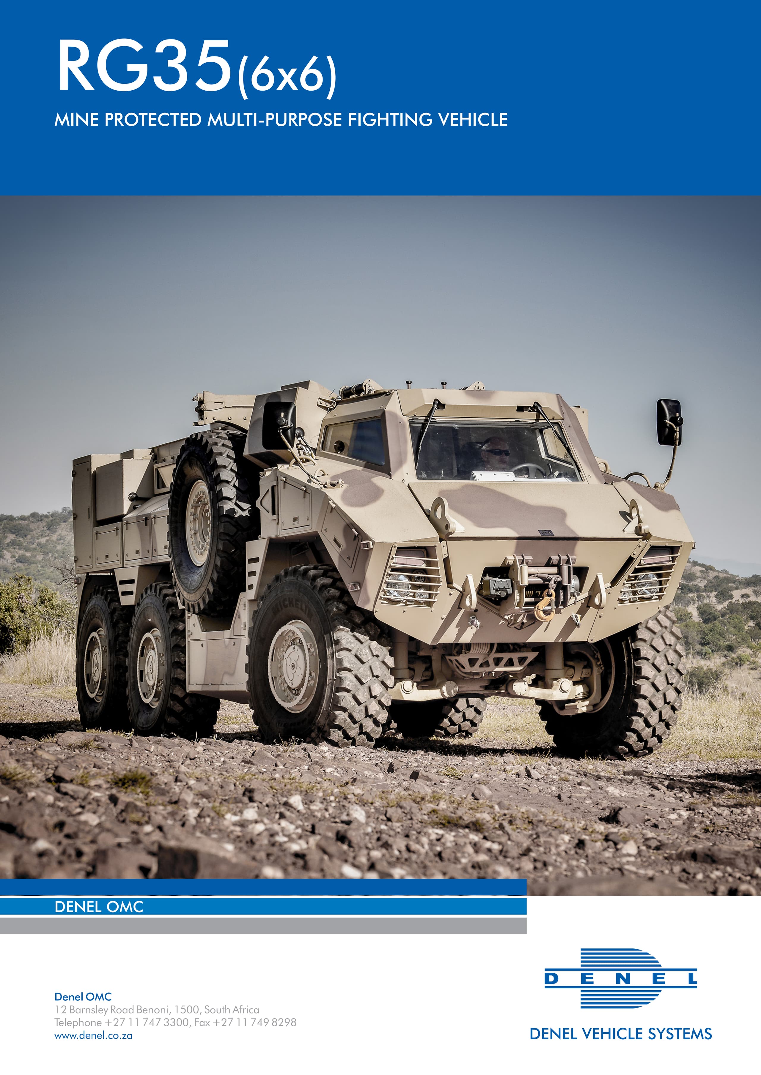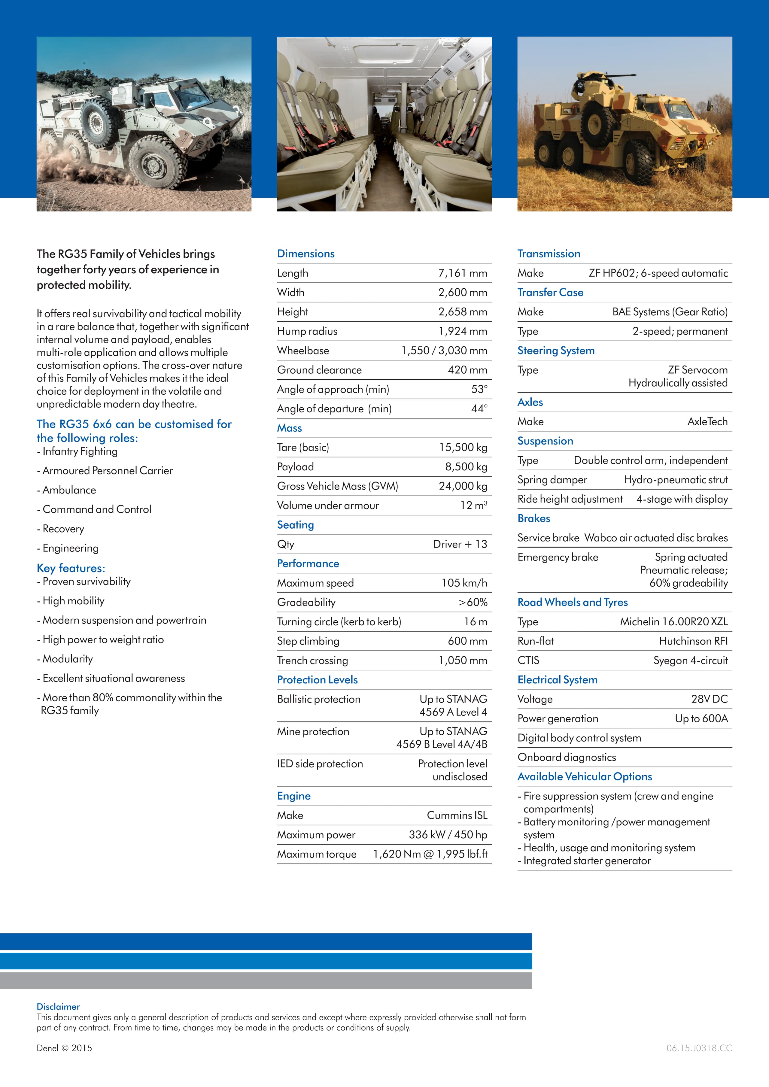 RG-35 представляет собой защищённый от мин V-образный бронетранспортёр 6 × 6, вмещающий в себя до 16 человек. Двигатель Cummins мощностью 410 кВт позволяет разгоняться до 115 км/ч, запас хода составляет 1000 км. Защита машины находится на 4 уровне STANAG 4569
