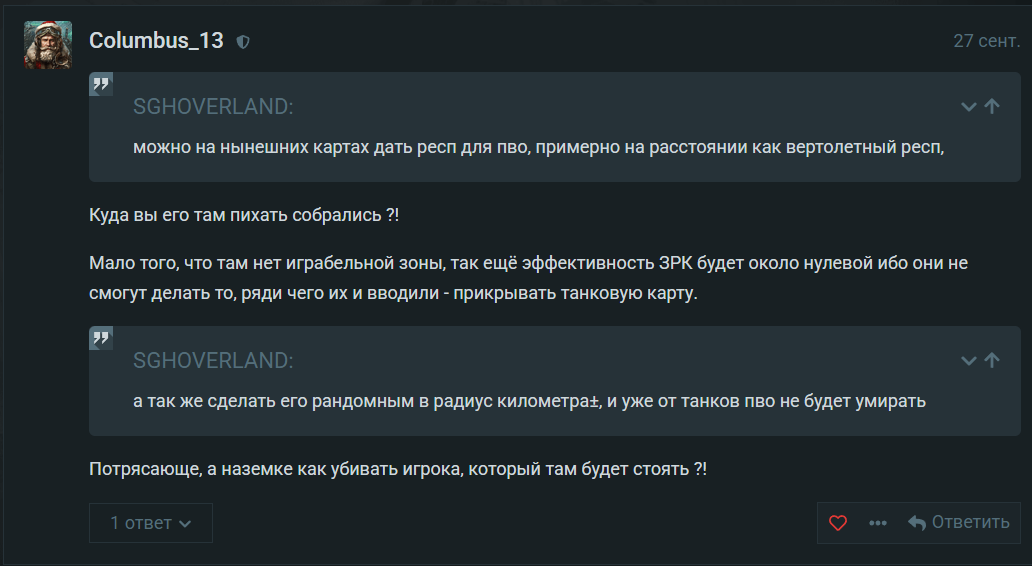 Игроки делают вывод, что это путь, выбранный разработчиком, а, учитывая недавний ввод тяжелых ЗРК на танковую карту, игрок решает последовать за логикой разработчика и предлагать варианты с учётом текущей реализации в игре техники и механик.