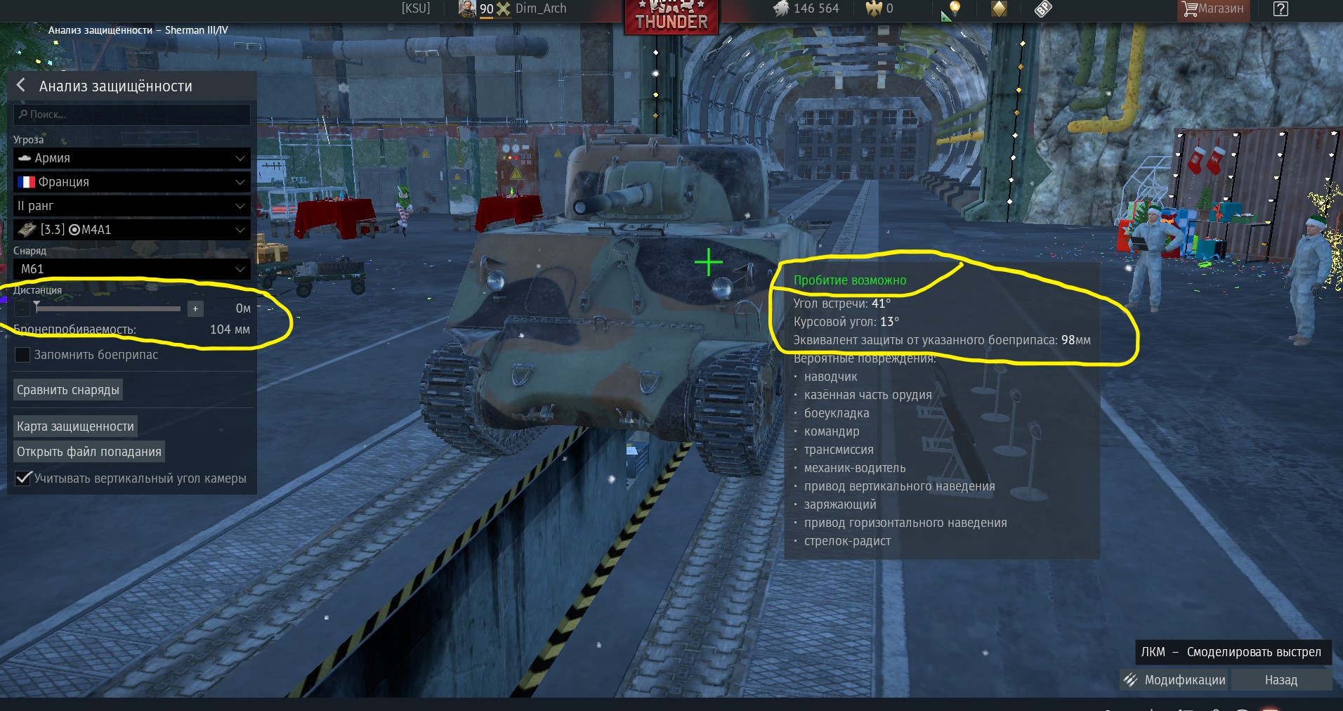 Вот тля чушь вы несете, не от этого бла-бла-бла это зависит, а от координат попадания, которых нигде НЕТ, но на последнем скрине приблизительно точно показана точка входа снаряда ПРИБЛИЗИТЕЛЬНО, но не ТОЧНО. Этот прибор под названием анализ защищенности, как я и говорил ранее бесполезен, это ХЛАМ поломатый. И еще, я находился выше свейского Шермана, соответственно моя пуха опускалась вниз и следовательно угол входа гораздо меньше 40 град и плюсом ко всему этому уг тот факт, что дистанция не 100 метров, а всего лишь 40 метров. То есть по правилам математики, если 100 м = 1, а 40 м = 0,4, то округляем до 0. Затем смотрим четвертый скрин и вы сейчас опупеете, меняется бронепробитие на 104, броня остается 98, а пробитие происходит даже при 41 град.