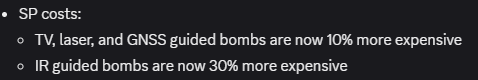 - TV, laser, and GNSS guided bombs are now 10% more expensive