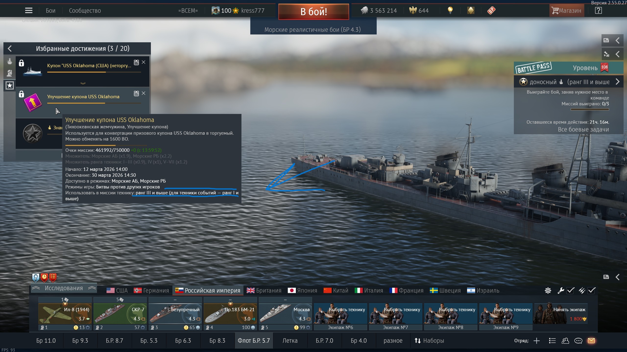 Зарабатывать очки миссии можно в морских сражениях от III ранга