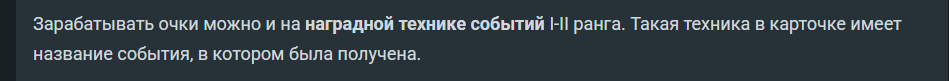Зарабатывать очки можно и на наградной технике событий I-II ранга. Такая техника в карточке имеет название события, в котором была получена.