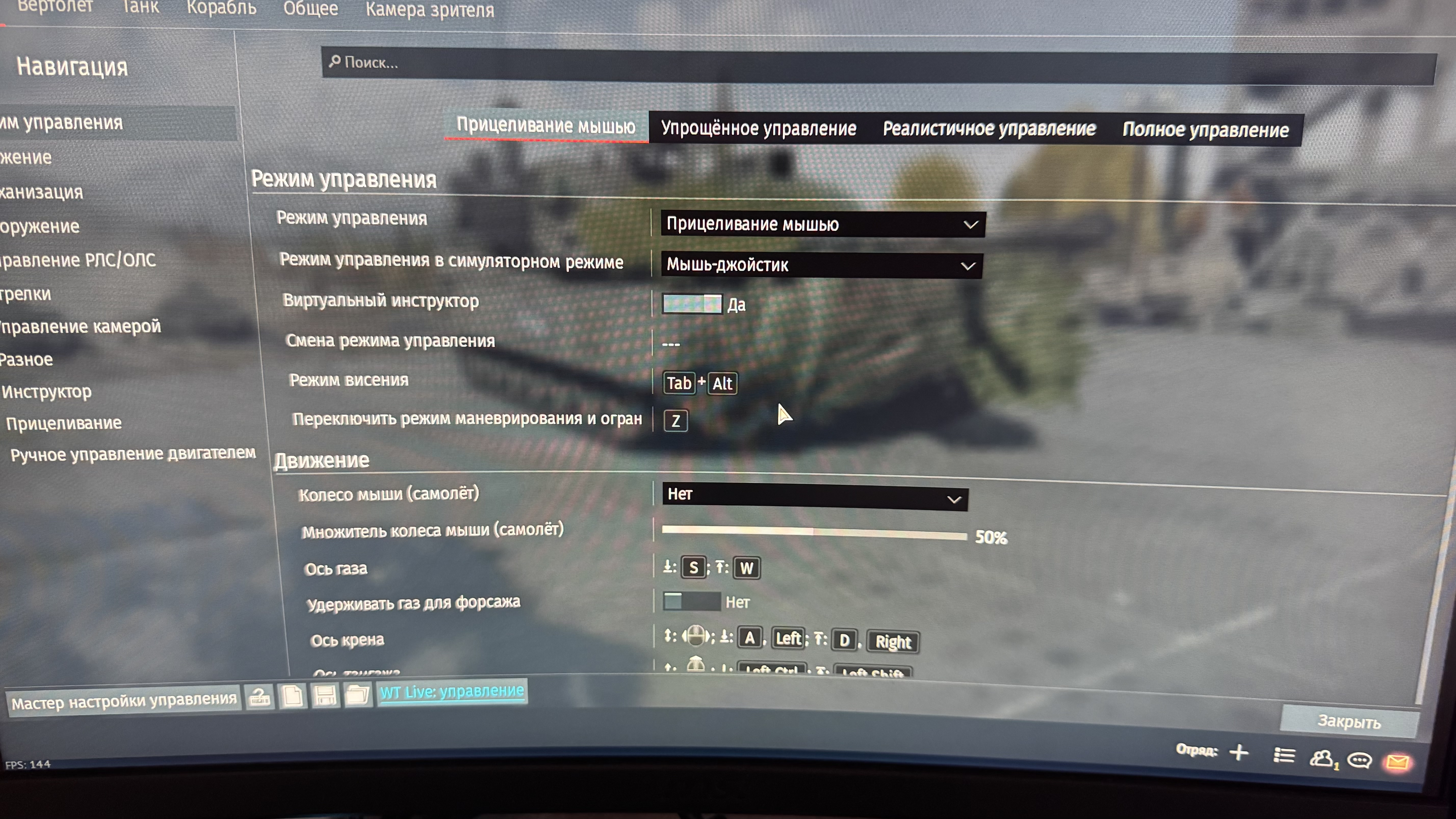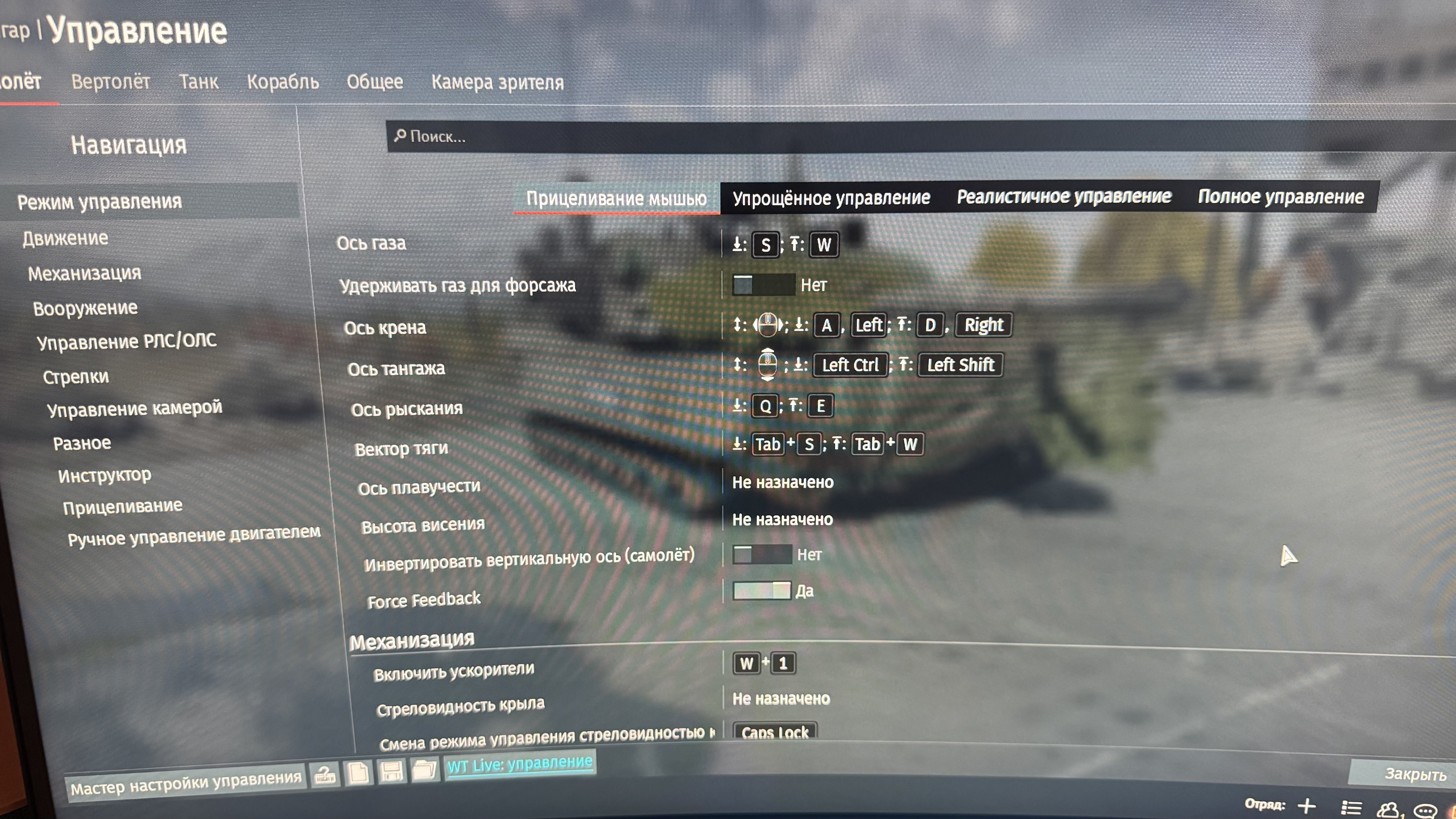 У меня ось газа на W/S, крен на A/D, всё как и было задумано улиткой ещё в 2013 году, это потом уже пришло поколение игроков, которые и не знали о такой вещи. Дублируется газ на колесико мыши, но там его не использую