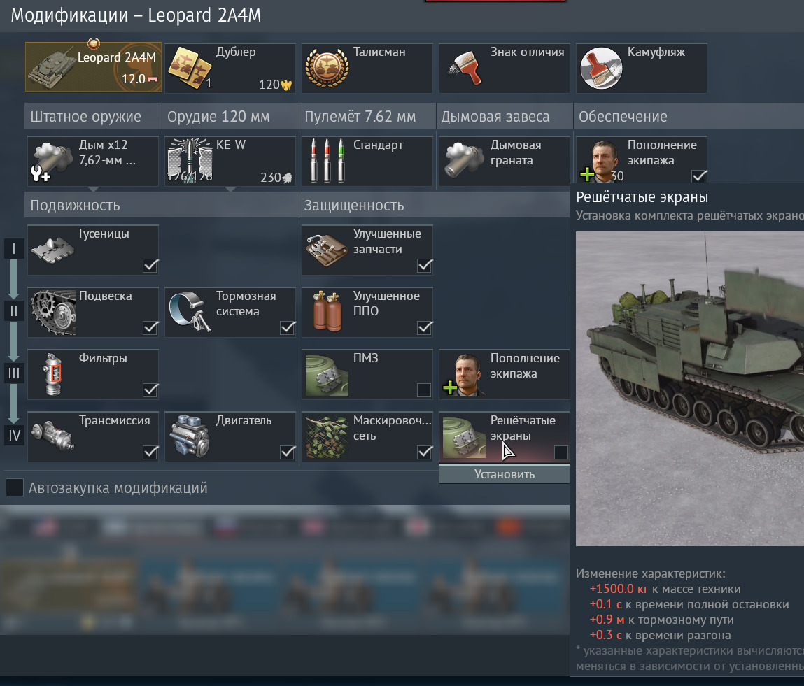 ◍Leopard 2A4M и Leopard 2A4M оба имеют модуль решетчатых экранов, которые добавляет обоим машинам одинаковый штраф по массе и мобильности,