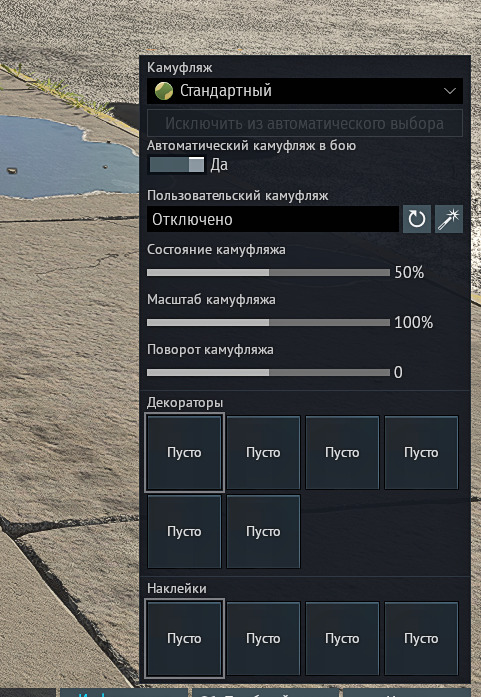Ползунки настройки камуфляжа можно по спойлеры скрыть без сохранения состояния. Открыл окно - всегда свёрнуты. Или слоты декораторов/наклеек отображать только по одному. Ну, открыл менюшку - один слот, добавил декоратор, появился следующий слот. А само окно можно растянуть на пол экрана, как с экипажем. Строчку ползовательского камуфляжа сунуть в отдельное меню. Классно же будет. А строку выбора камуфляжей стандартных вложить во вторую вкладку в этом же окне. Одна вкладка камуфляжей, вторая вкладка с настройками. кайф.