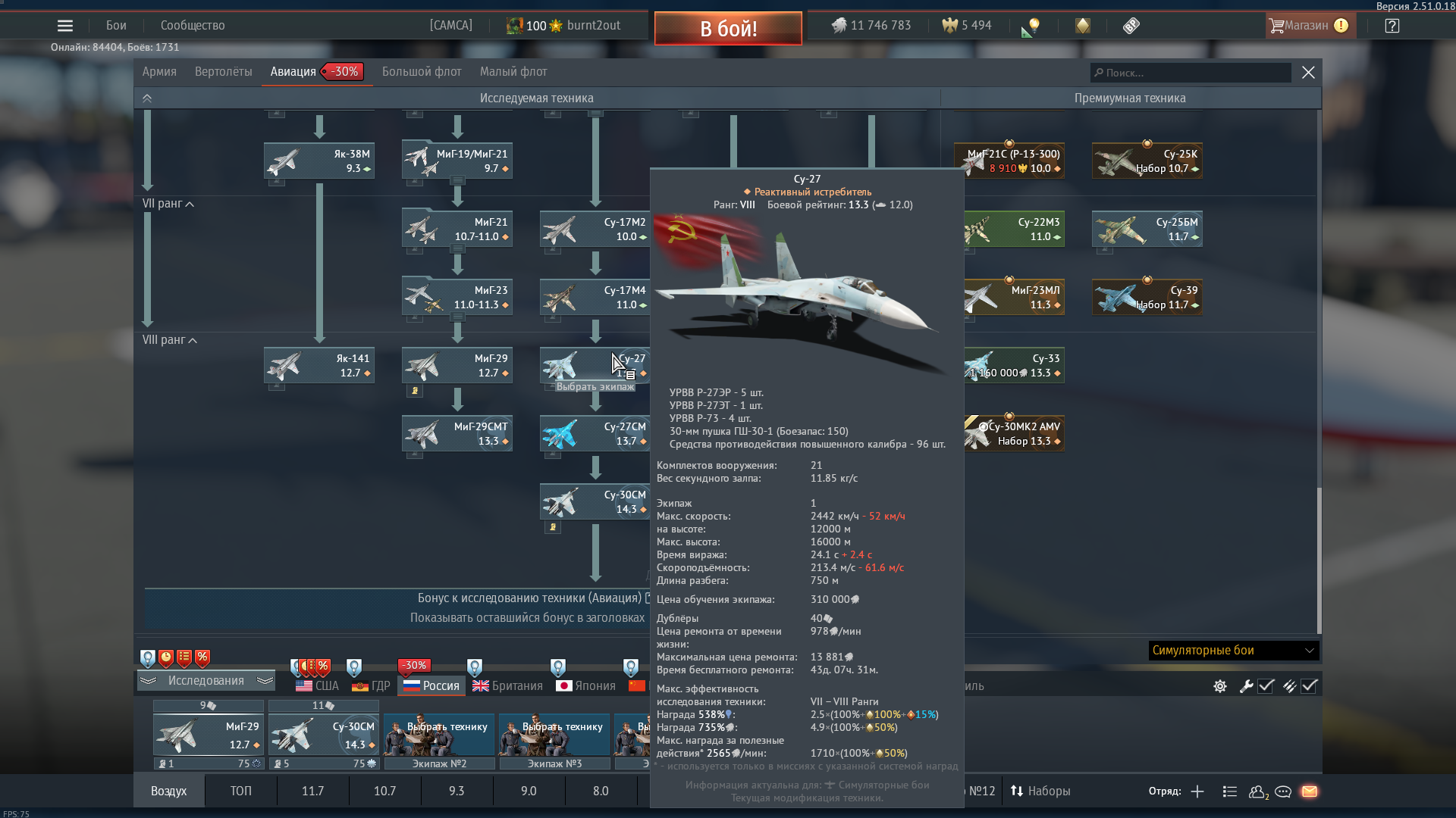Хрю-му. МЛД с 2 Р-24, 2 Р-73 и РЛС без нормального ИД режима будет более эффективен, чем бизон с полноценным ИД, СНП и НСЦ и практически таким же набором ракет. При том что база МиГа-23 на 12.0 и выше особых преимуществ перед базой МиГ-21 не имеет - они одинаково проигрывают в ЛТХ самолетам следующего поколения. При этом МиГ-23 не сможет даже полноценно использовать маневренность своих Р-73 из-за отсутствия нашлемки и значительных ограничений по углу атаки самого самолёта. Ох уж эти сказочки, ох уж эти сказочники.