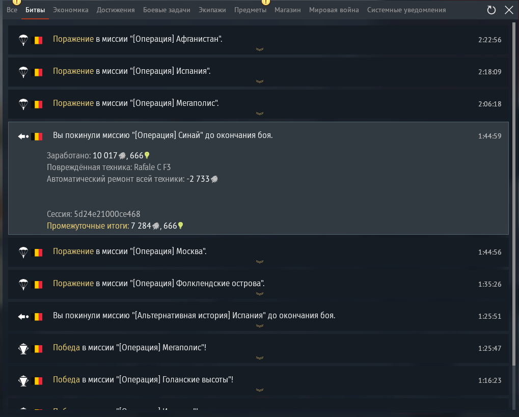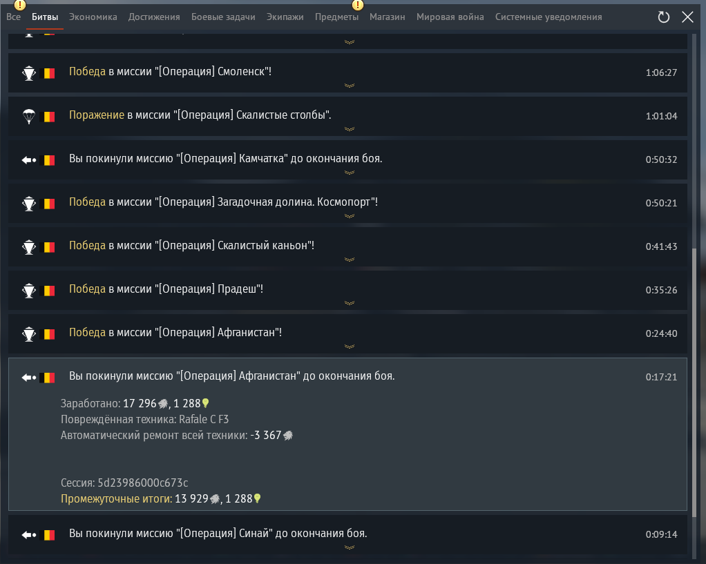 У меня два боя стерли просто напросто, никакой памяти не осталось. Вы покинули бой-нету, и не прибавилось фрагов. Просто взяли и стерли из жизни моей по 15 минут счастья(много фрагов было). И к концу боя вылеты были, не в начале.