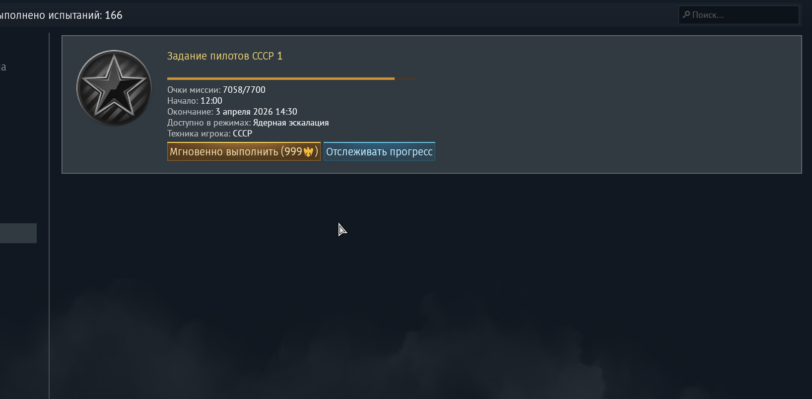 Поправка, не так выразился. Достижения-Ядерная эскалация. Там выбираете нужное достижение, ставите в избранное и оно будет у вас отслеживаться в ангаре слева.