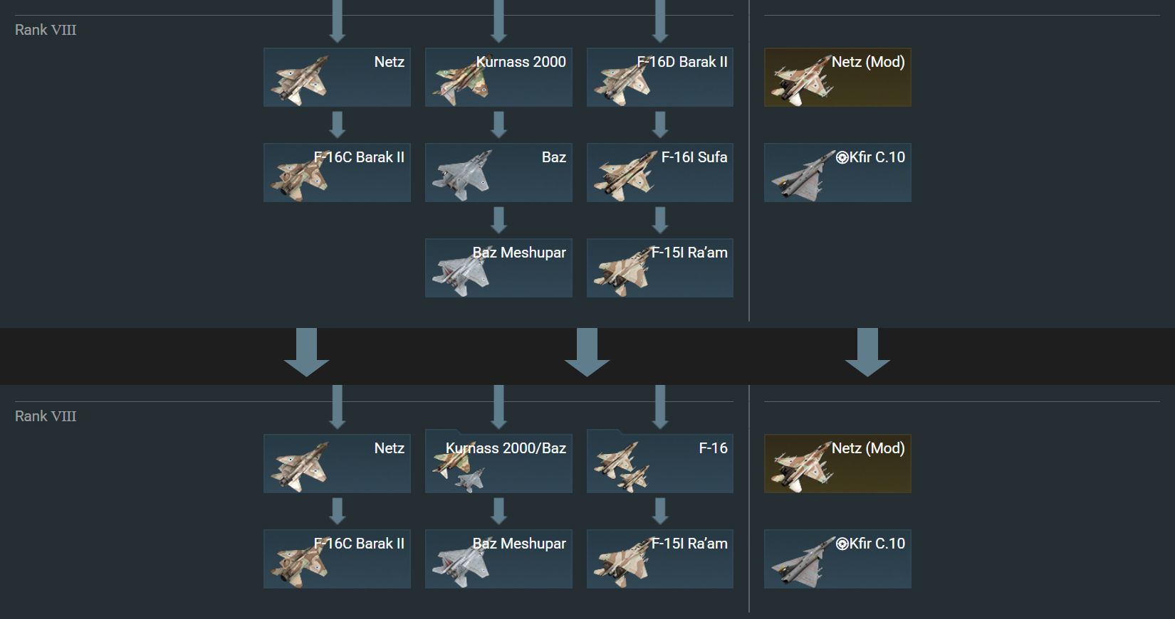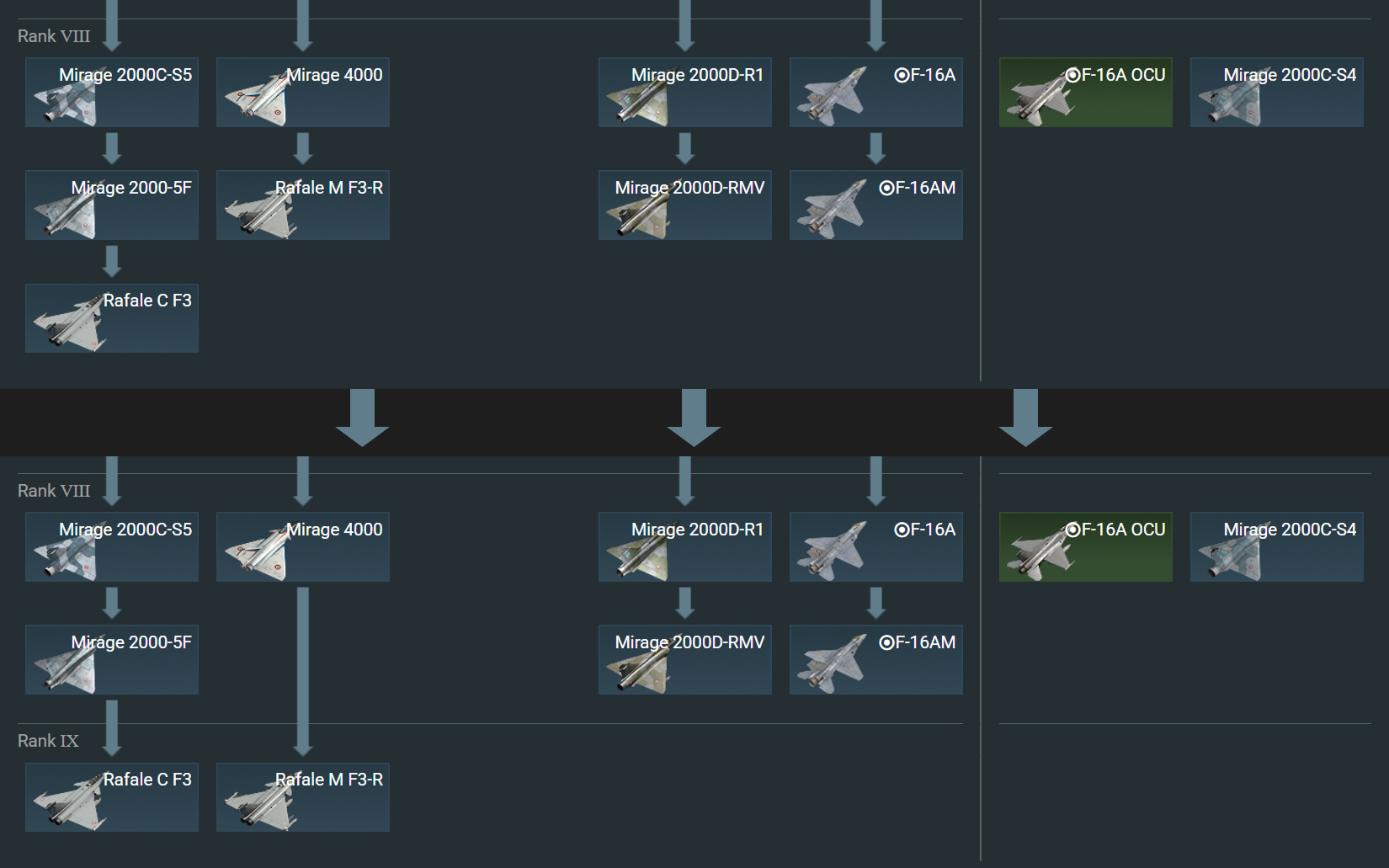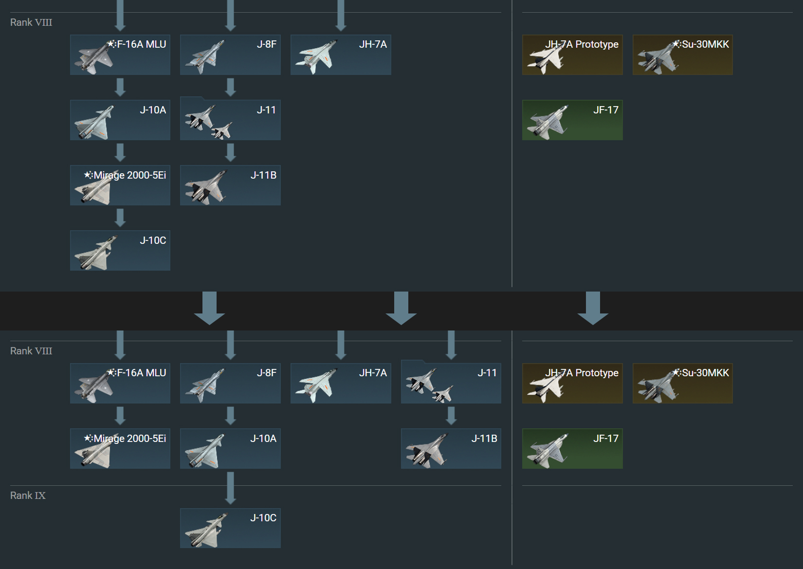 Отдельно хотелось бы отметить изменения, которые коснутся авиации Китая. Вместе с появлением нового ранга мы планируем пересмотреть расположение топовых самолётов, которые в данный момент неравномерно распределены между ветками в дереве исследования.
