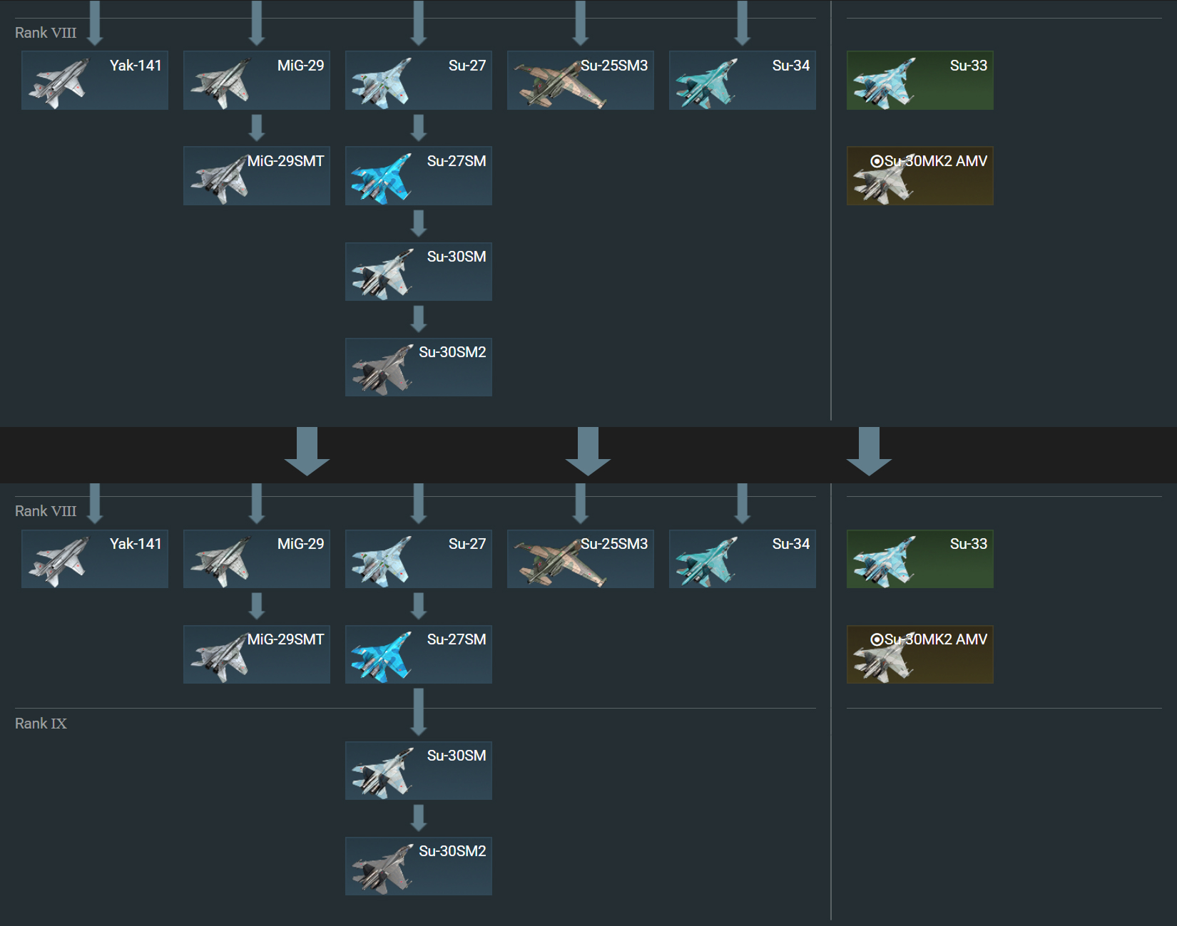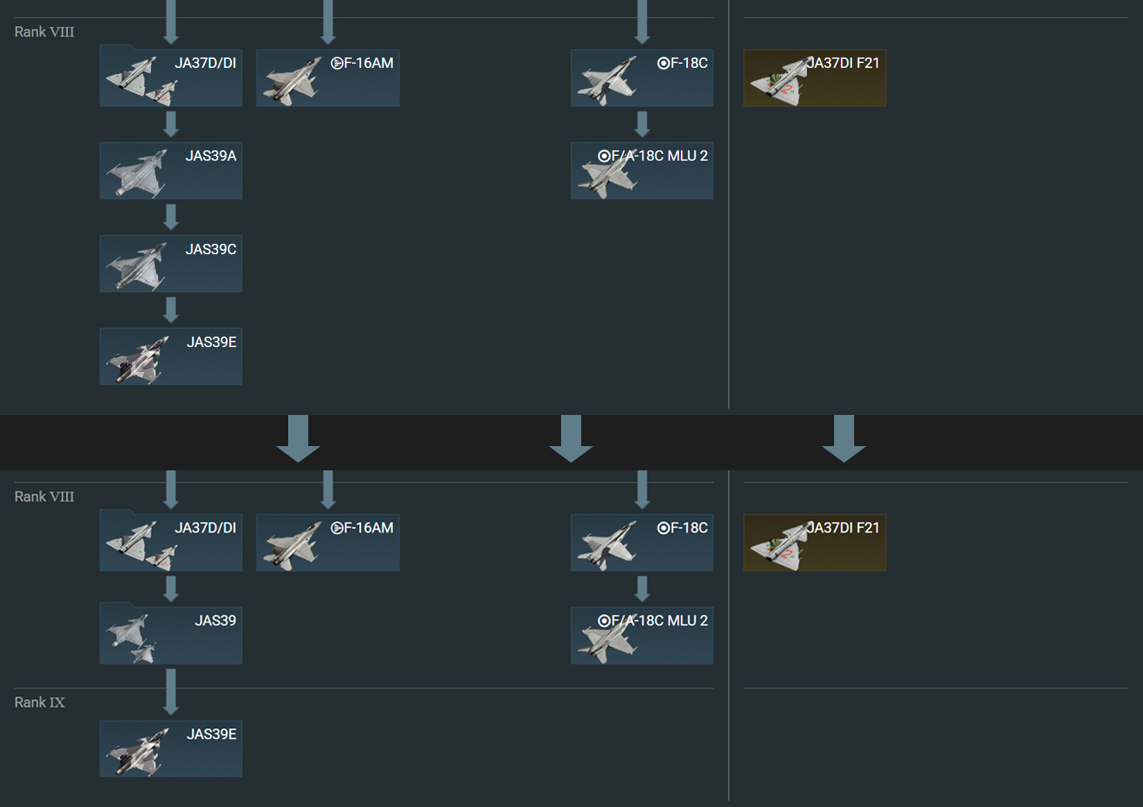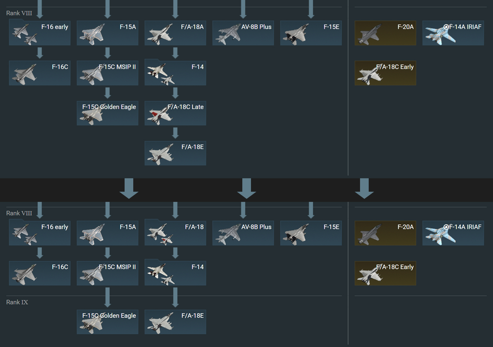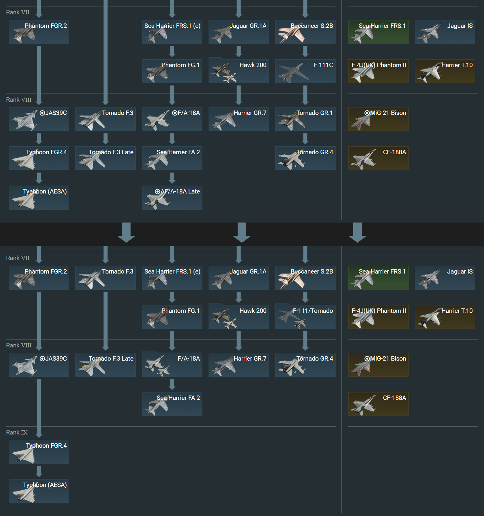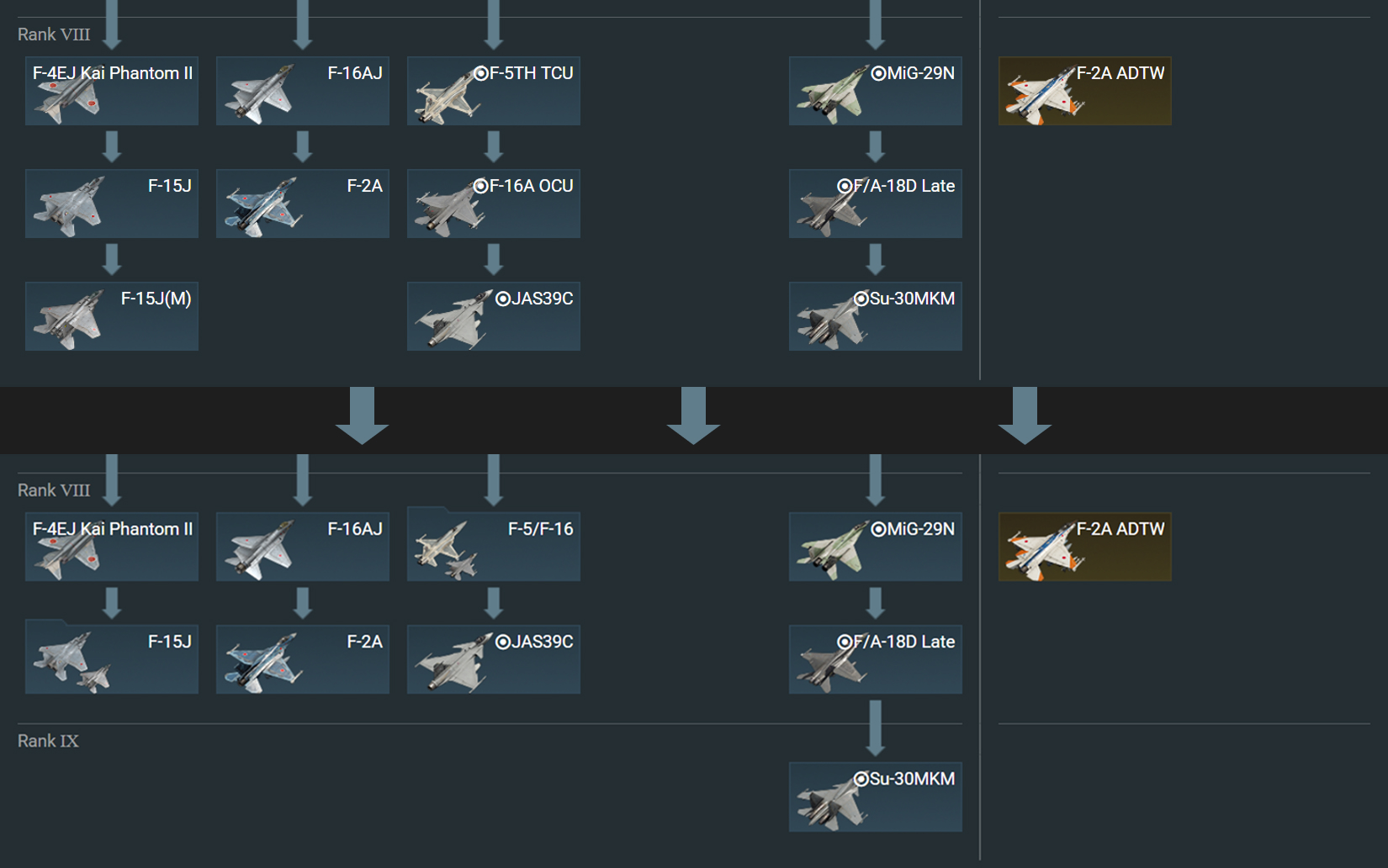 В ближайшем будущем в War Thunder появится новый IX ранг авиации, на который переместится часть уже существующей топовой техники. Некоторая техника VIII ранга будет сгруппирована. Планируются и другие сопутствующие изменения: например, некоторые ранние версии Tornado переедут на VII ранг.