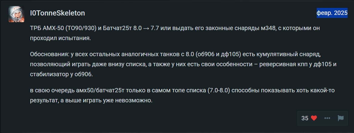 (РБ) Tortoise 6.7 > 6.3 — Медлительная машина, которая уязвима в зоне командирской башенки для снаряда БР-365 (135мм в нормаль) + уязвима для авиации + при попадании на 7.7 получает больные попадания от различных мощных 120мм пушек тяжёлых танков 7.7 и при этом не может внятно ответить из-за той же медлительности. В общем, на 6.3 данная машина всё ещё будет уязвима для большего числа снарядов, авиации и всё ещё присутствующих КС и при этом будет в большей степени соответствовать своей концепции “бронированного ДОТа”, т.к. не будет встречать довольно злые пушки с 7.7.